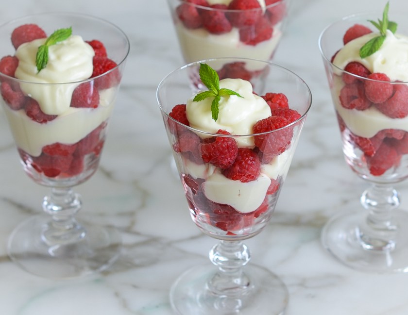 Divide raspberries in half, evenly distribute half of the berries in the bottom of the glasses. Evenly distribute two-thirds of the cream mixture to cover the berries in each glass. Gently top with the remaining berries divided evenly among the glasses. Spoon remaining cream in a dollop on top of the berries. Refrigerate at least an hour, or up to 4 hours. Garnish with mint just before serving.