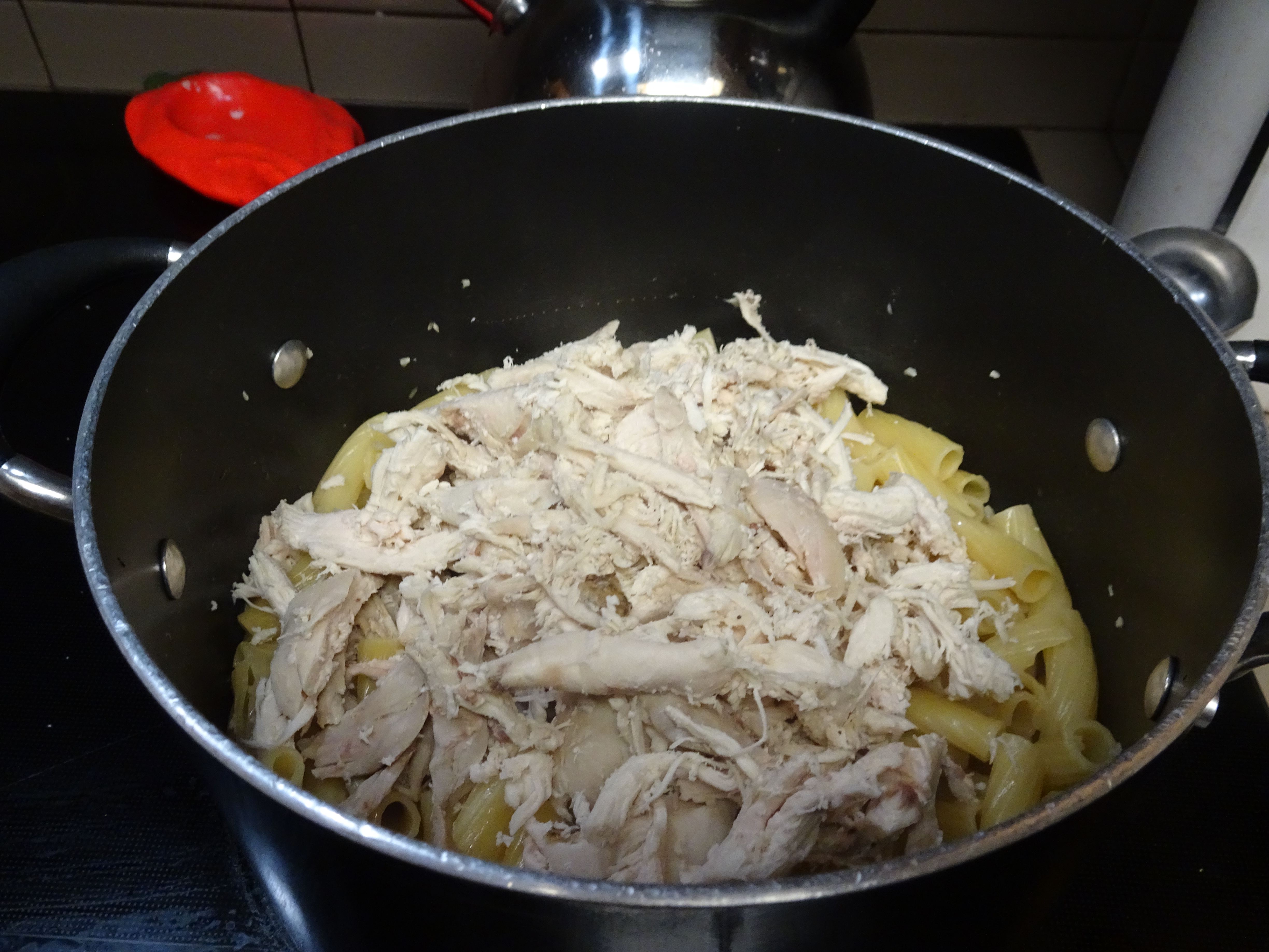 Stir in chicken; continue heating 1 to 2 minutes or until heated through. Remove from heat; stir in grated lemon peel, and top with Parmesan cheese. Garnish with fresh basil.