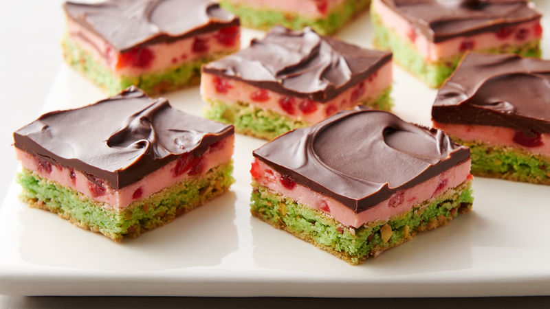 Lift Spumoni Bars from the pan, cut into squares and arrange on a serving platter. Serve and enjoy.