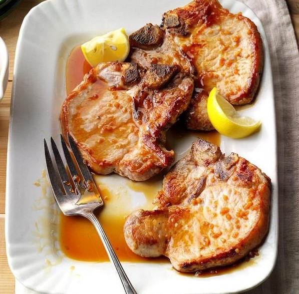 Spoon sauce over pork chops. Cut lemon into wedges to garnish the serving platter.