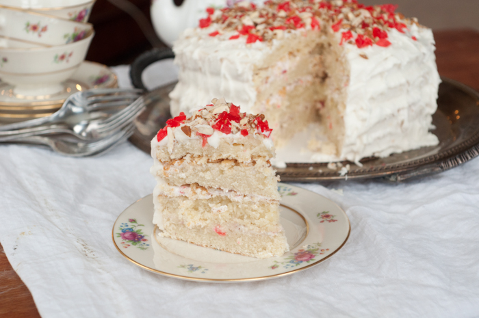 Frost top and sides of the cake with remaining half of the 7-minute frosting. Scatter remaining chopped cherries and nuts over the top of the cake. Serve and enjoy.