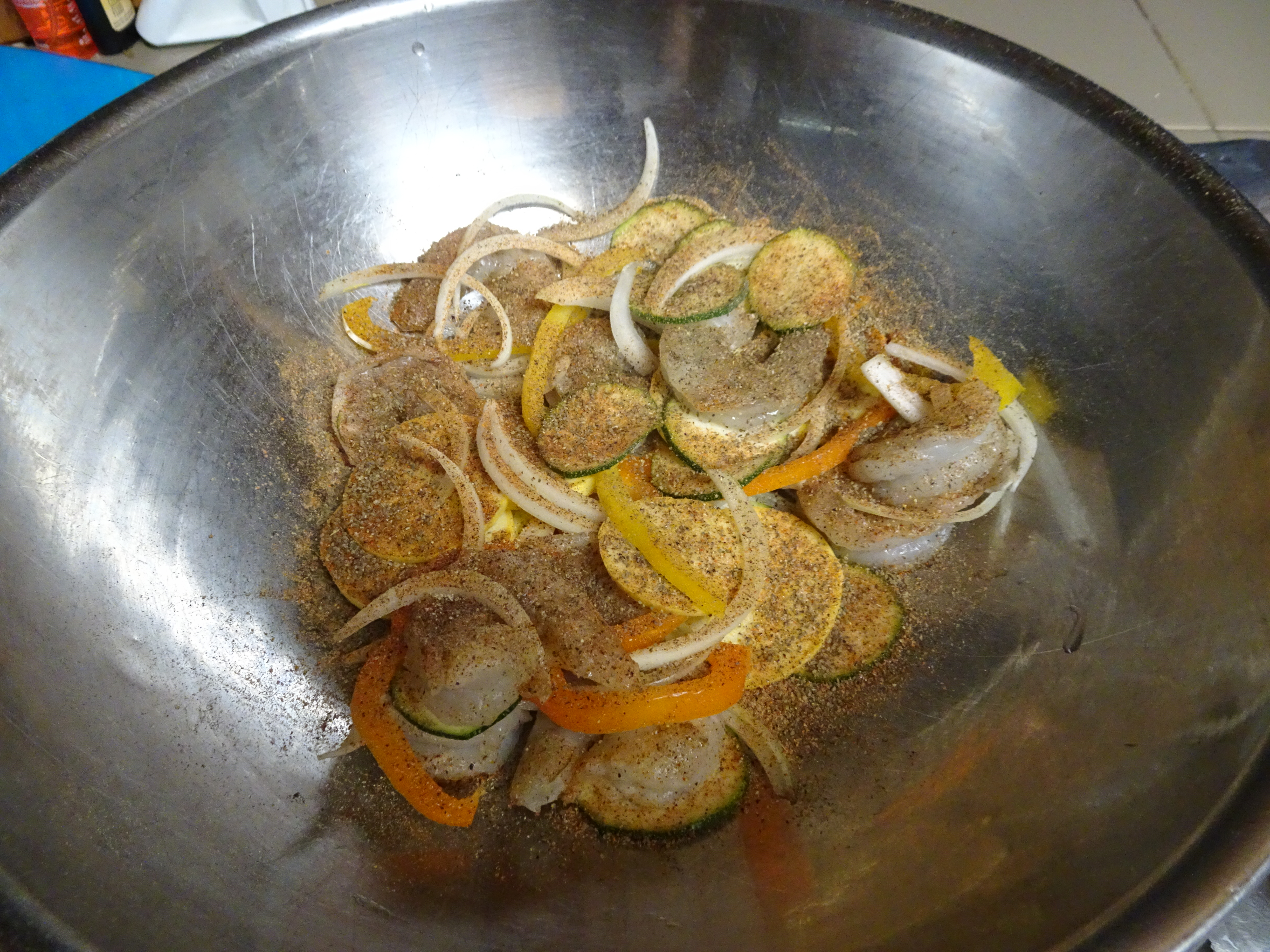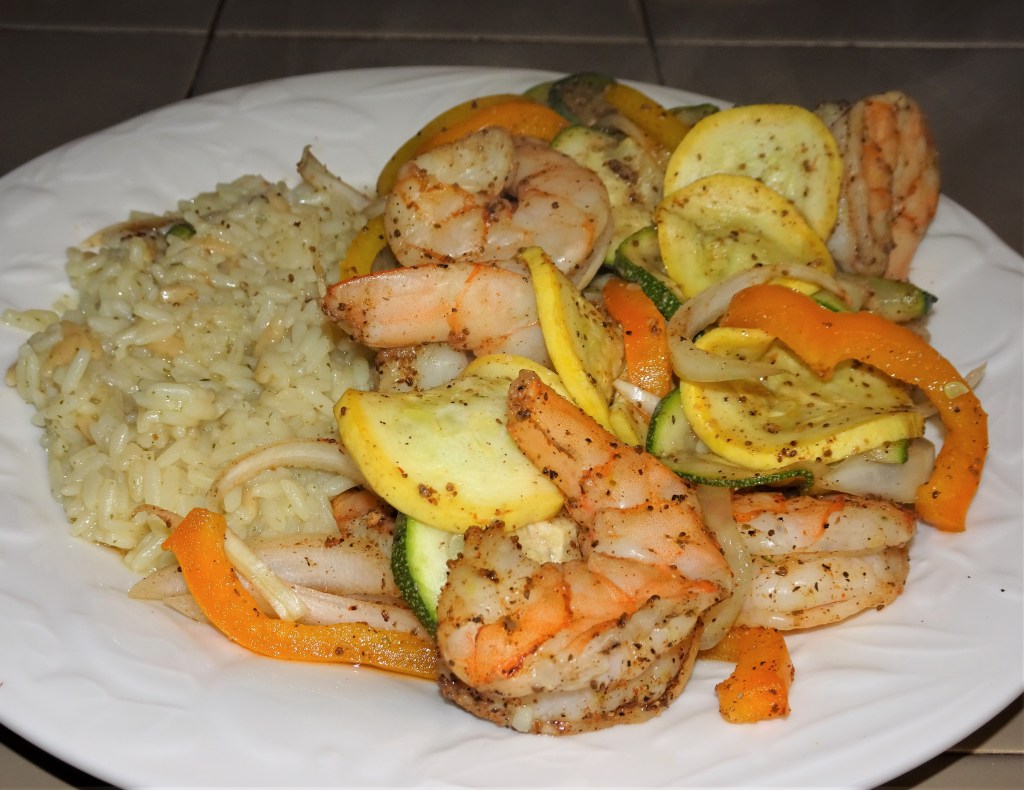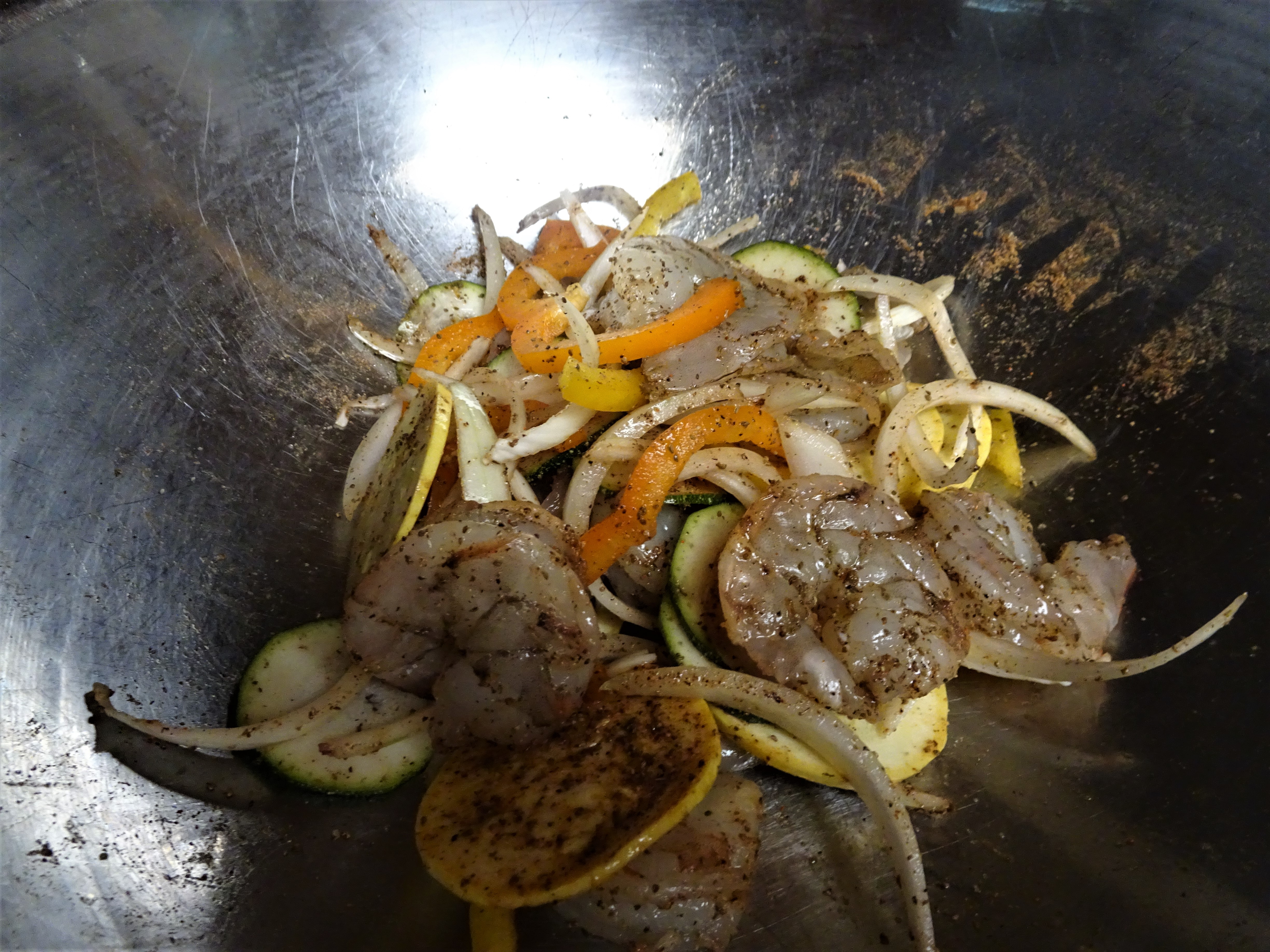 Clean, peel and devein shrimp. Remove tails and place shrimp in a large mixing bowl, set aside. Slice squash, set aside. Cut bell pepper in half from stem to bottom, reserve half for another use. Slice remaining half into strips, set aside. Cut a quarter of onion from root to tip, reserve remaining onion for another use. Peel and cut quarter into thin slivers, set aside.