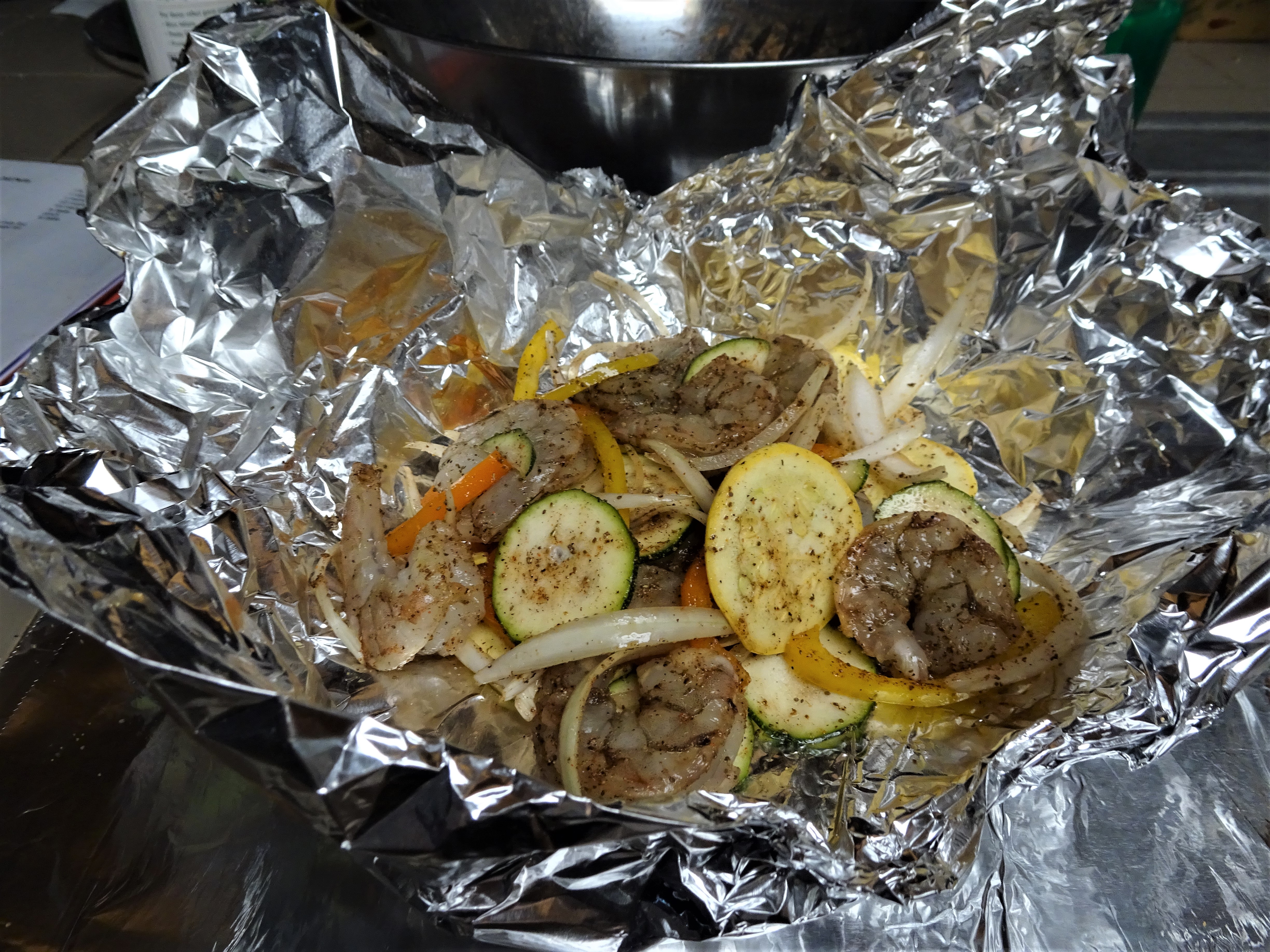 Scatter vegetables over the shrimp. Toss to blend mixture. Season generously, toss again. Divide mixture between foil packages. Close packages tightly, place on a baking sheet.