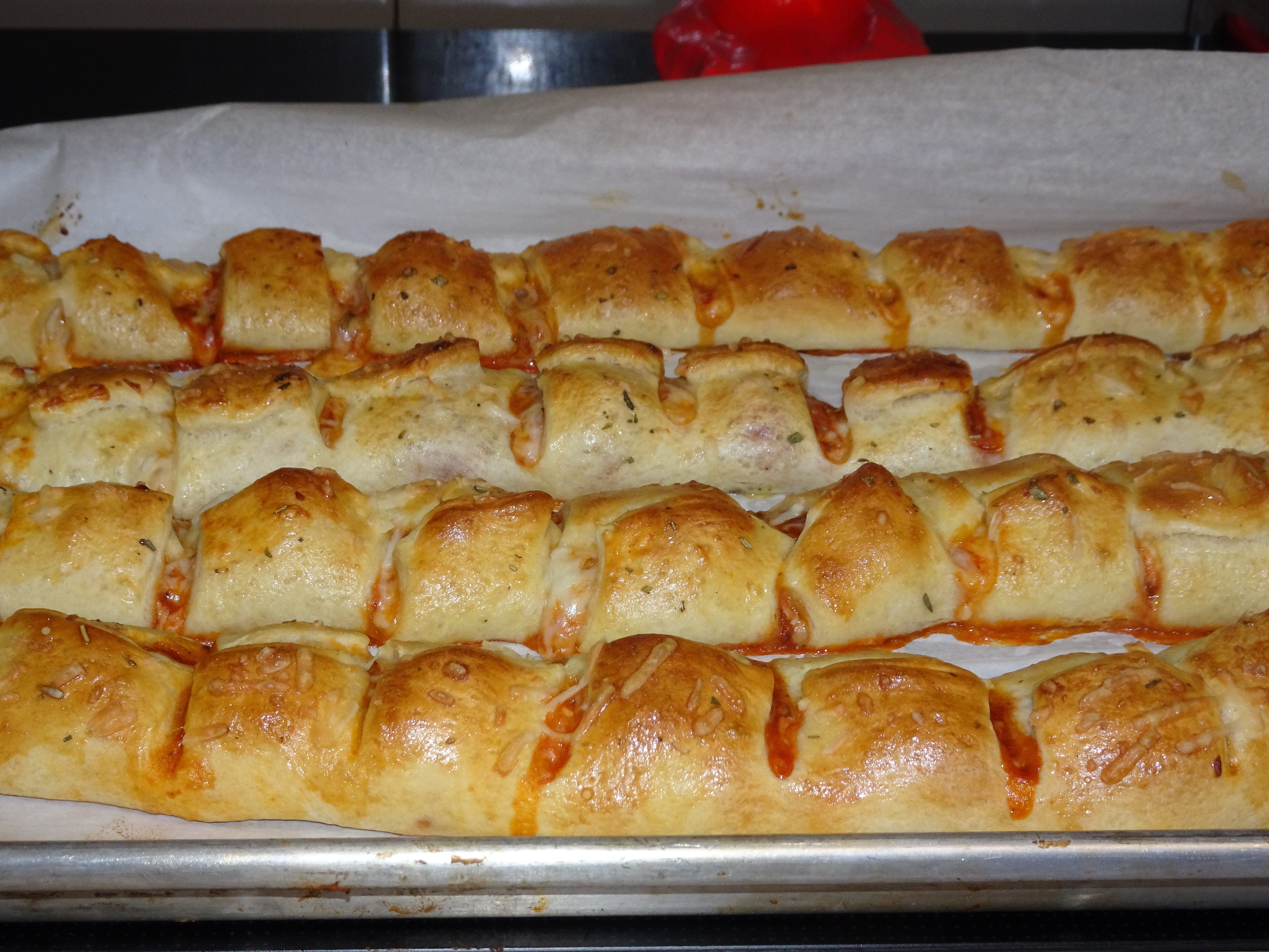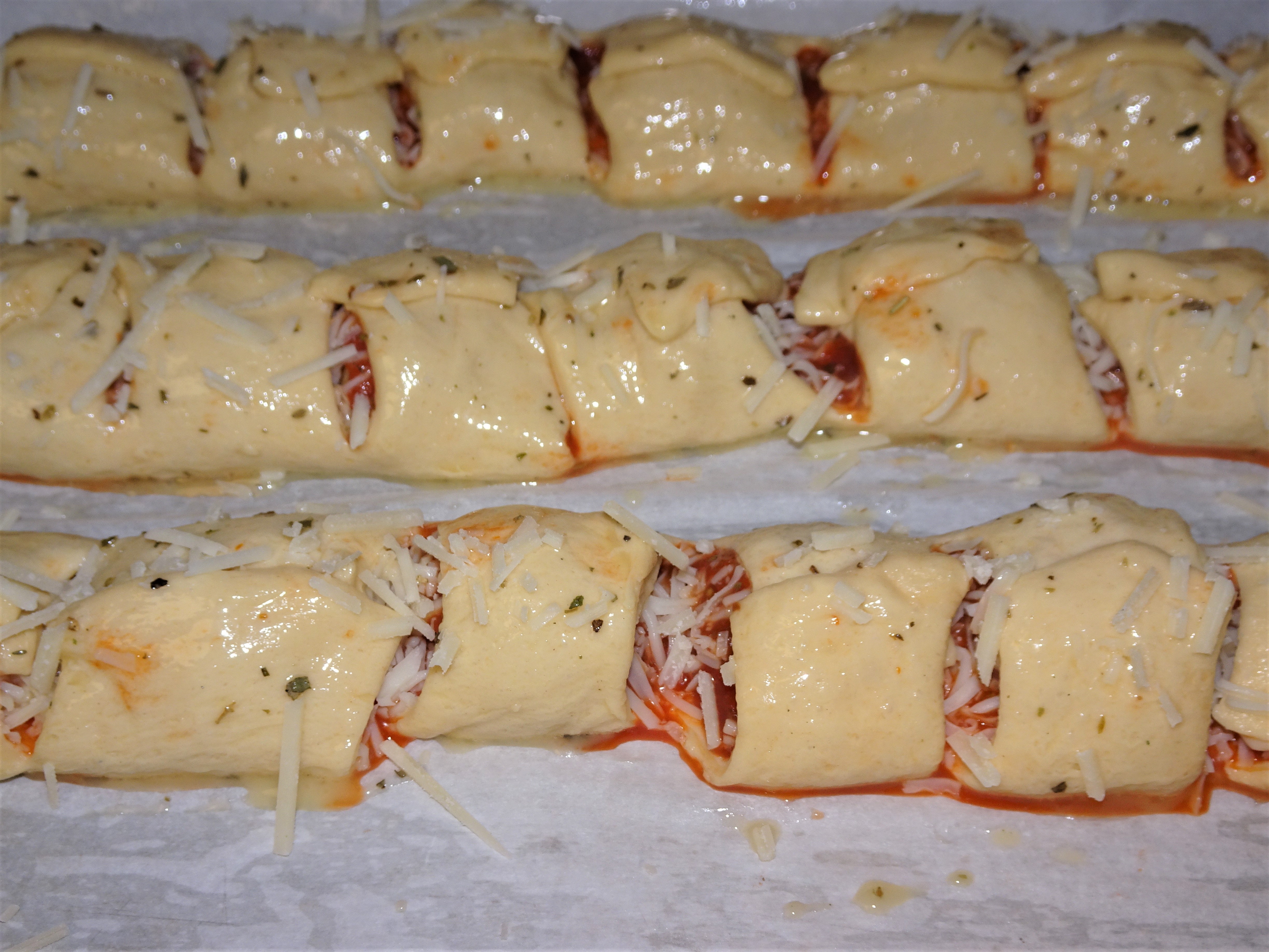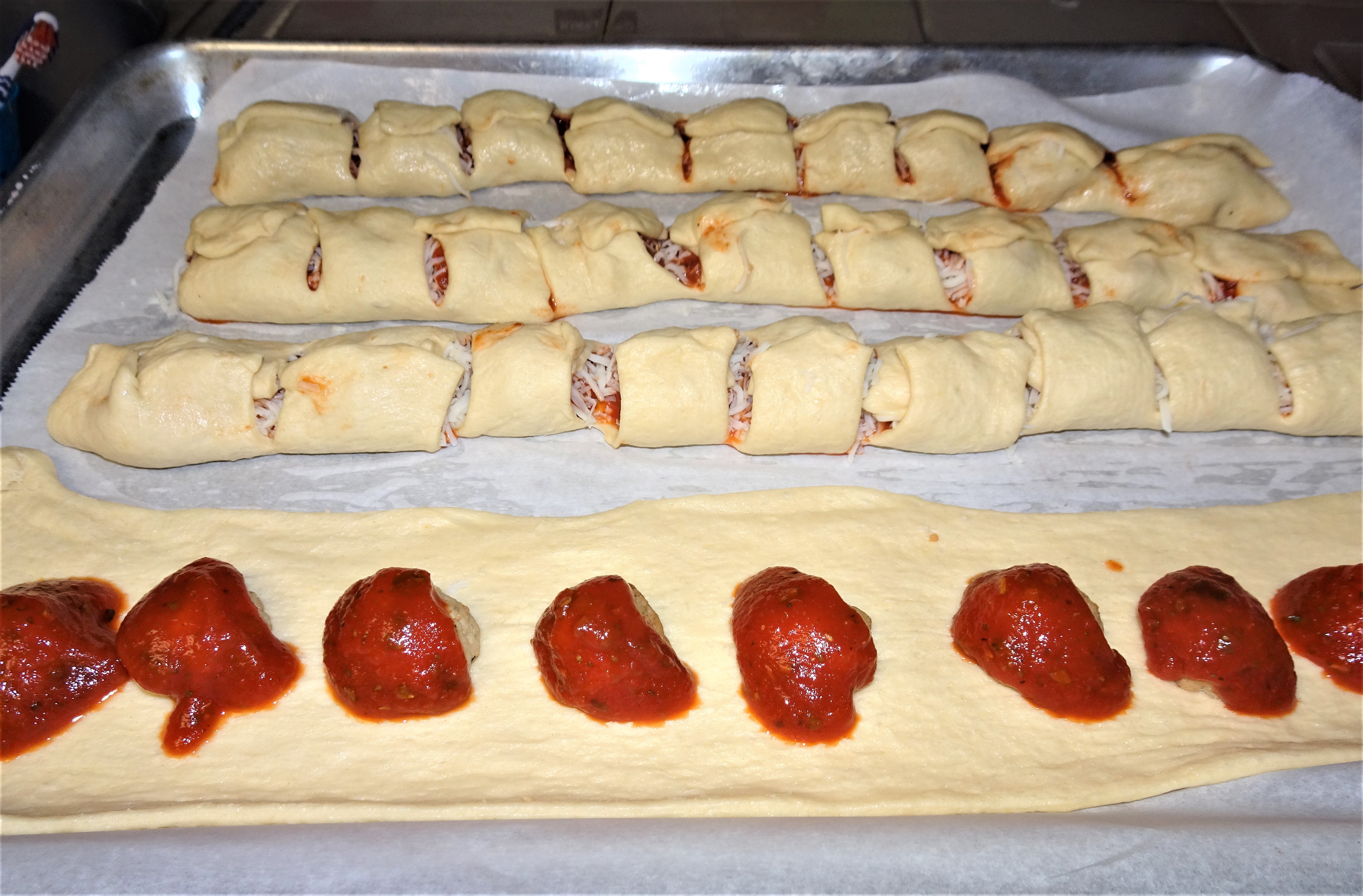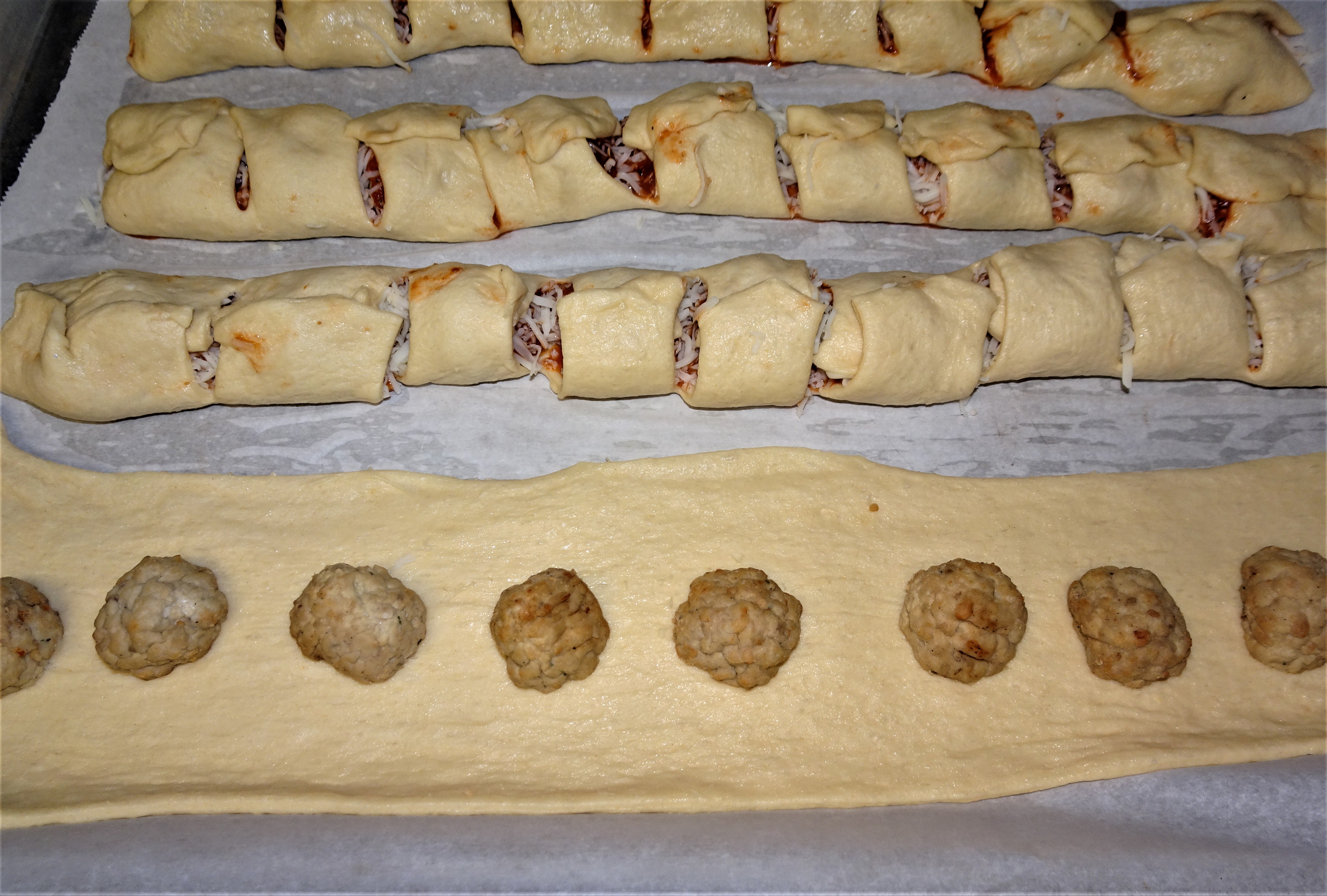 Cut thawed meatballs in half. Working with one rectangle of dough at a time, place 8 meatball halves lengthwise down the center of the dough. Top each meatball with 2 tablespoons pasta sauce and 2 tablespoons Mozzarella Cheese.