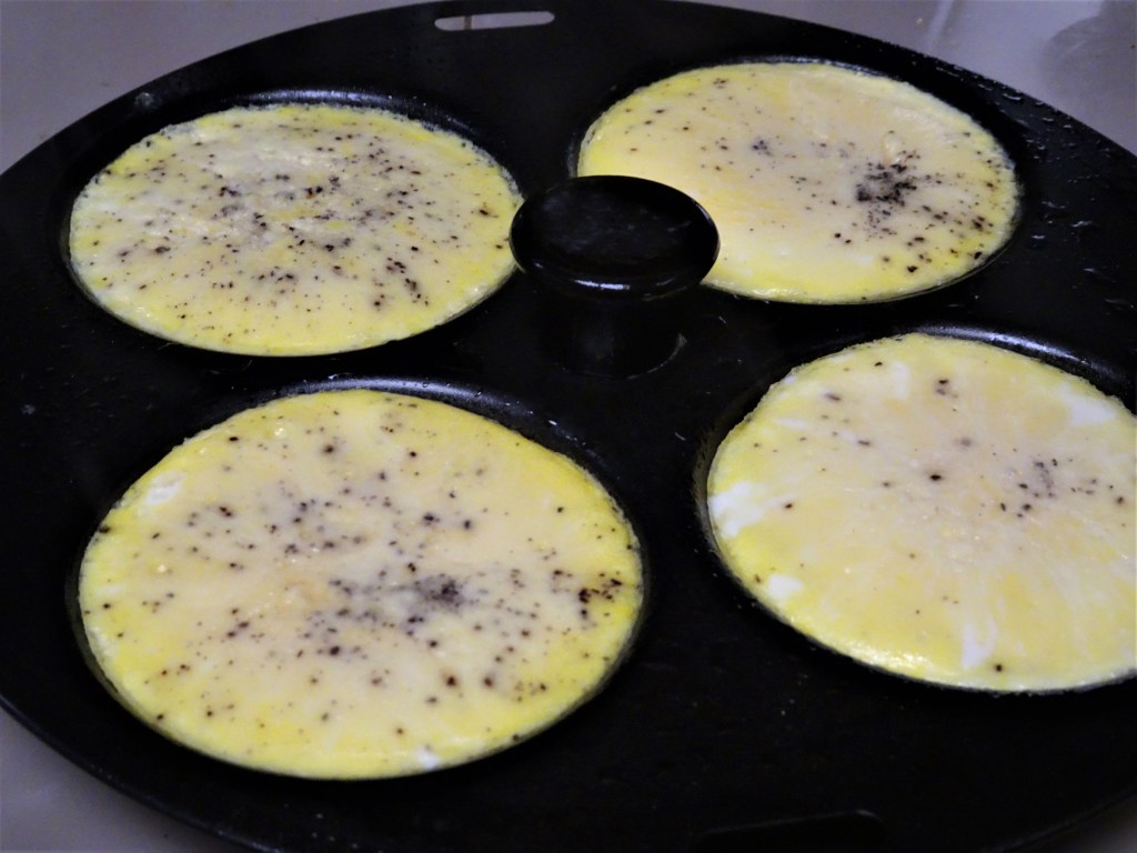Working with one egg at a time, crack egg into a glass measuring cup. Beat egg, season with salt and pepper, then pour mixture into the cup of the egg poacher. Repeat until egg cups are filled. Place poacher over steaming water.