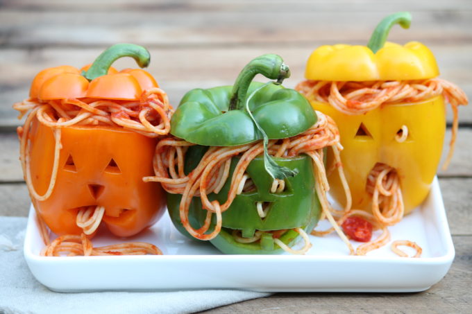 Carve faces in the bell peppers while still whole. Don’t worry about the small pieces. Cut the tops from the peppers. Hollow out seeds, remove any small pieces from carvings. Set tops aside.