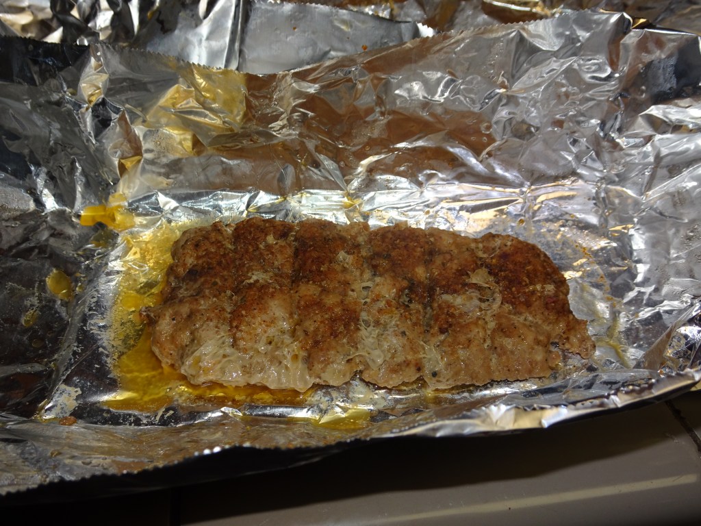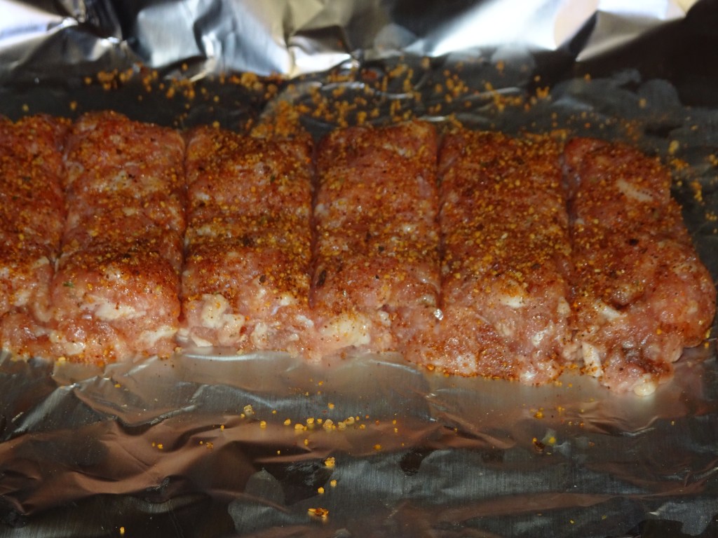 Lay out a single sheet of aluminum foil. Divide the meat mixture into 6 equal parts. Press ground pork into a patty that will roughly fill the rolls. Using the back of a butter knife, press rib ‘lines’ into the patty to mimic ribs. Sprinkle with barbecue seasoning to taste.
