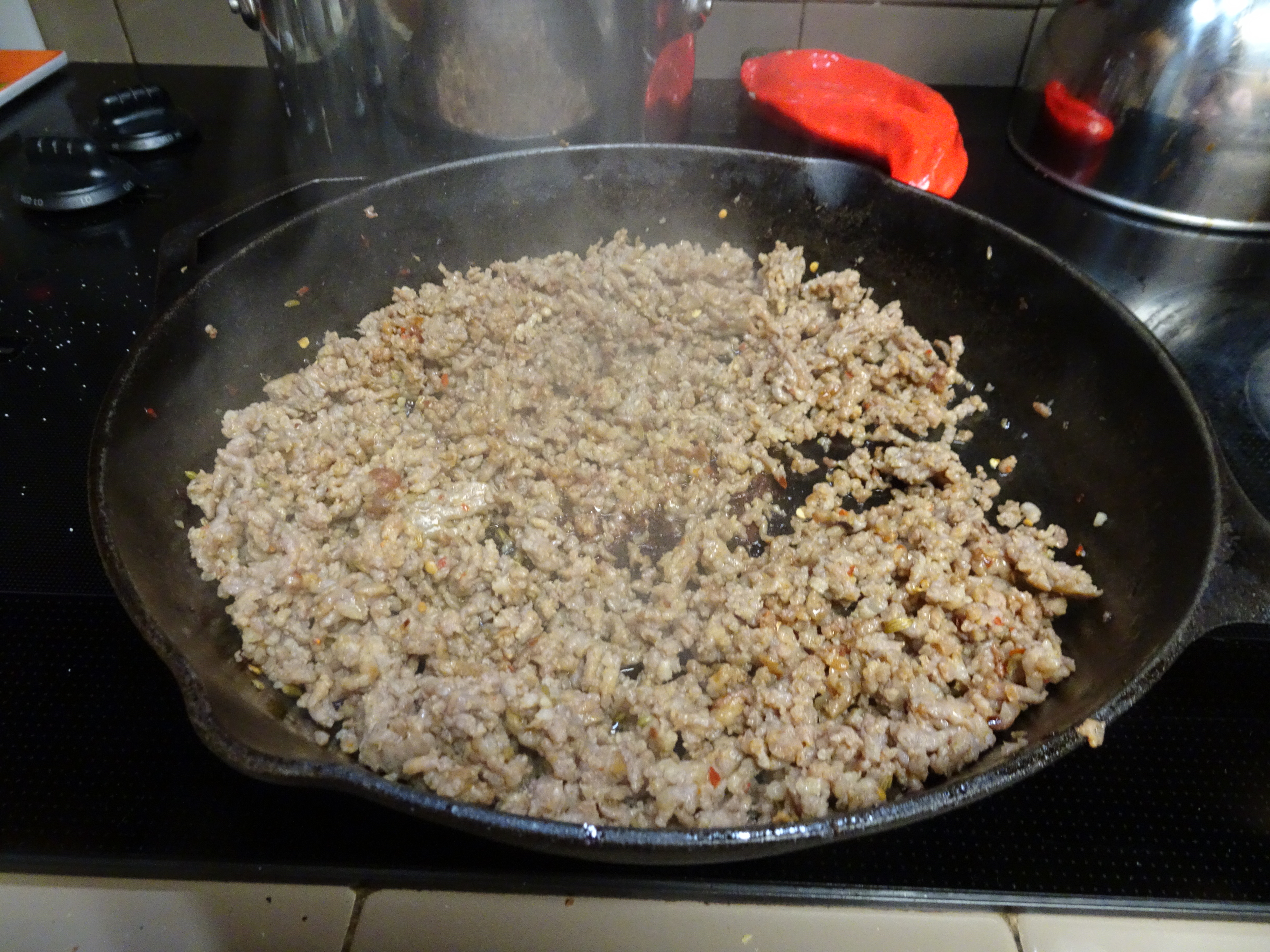 Stir cooked pasta into sauce, and heat through. Snip parsley, scatter over pasta in the skillet. No need to move to a bowl – it’s “manly” to serve from the skillet, don’t you think?