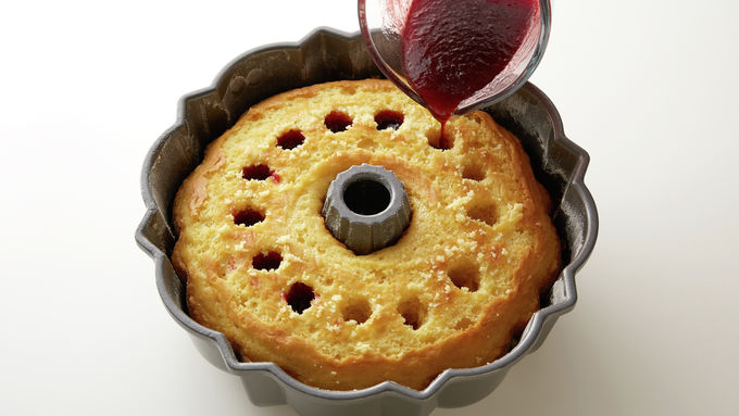 Pour jam into holes in cake. Cool cake in pan 1 hour. Run metal spatula around outer and inside edges of pan to loosen cake. Remove from pan to cooling rack. Cool completely, about 30 minutes. Transfer to serving platter.