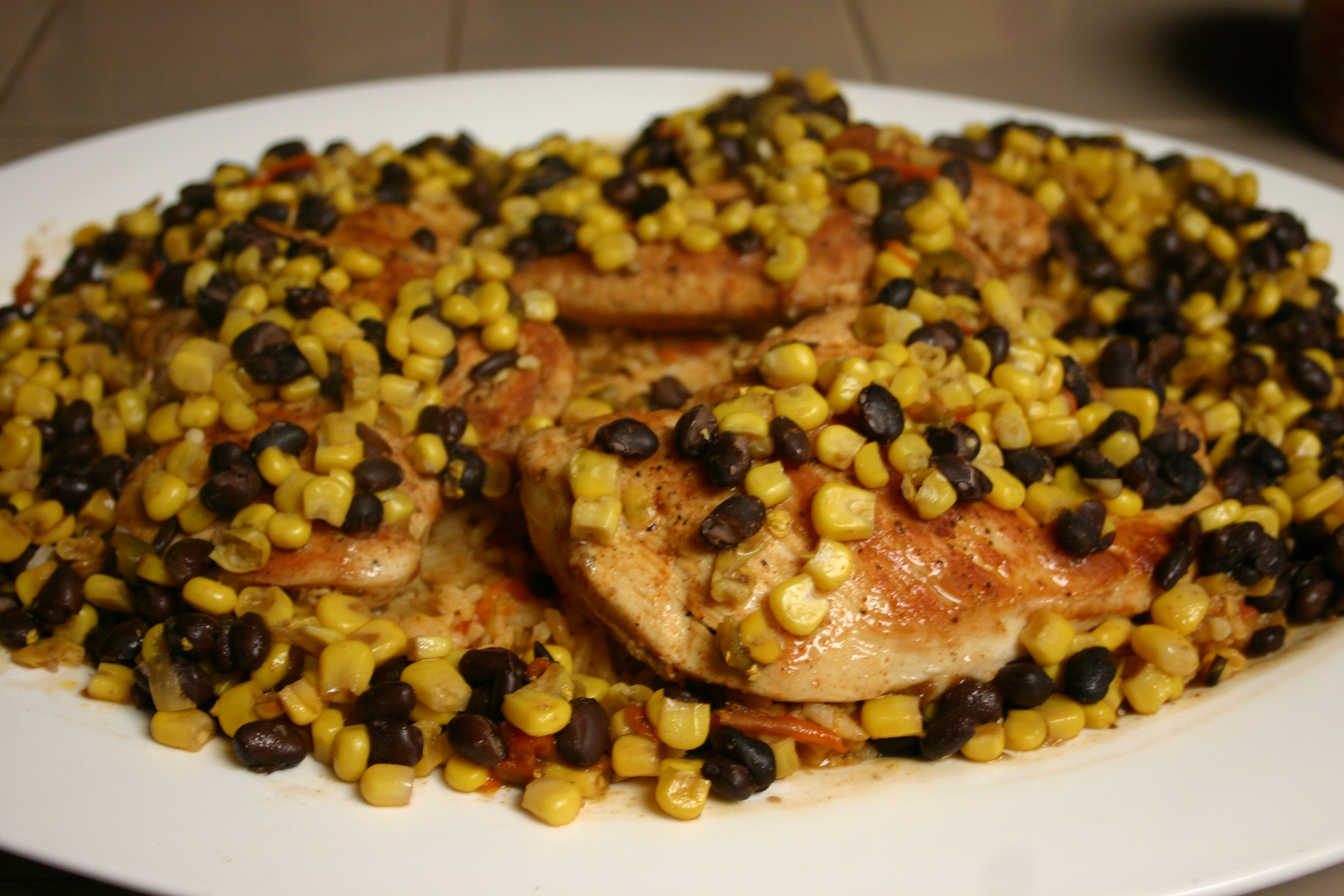 To serve; spread rice out on a serving platter. Place a chicken breasts over the rice. Spoon some of the bean mixture over the chicken. Serve with warm tortillas.