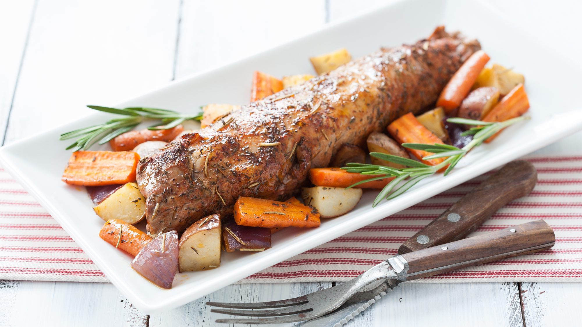 Arrange vegetables around the pork. Garnish with fresh rosemary. Slice pork tableside and serve with vegetables.