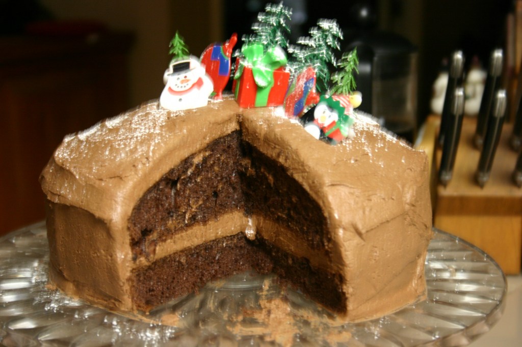 Not everyone has the need for a big cake. Perhaps you’re contributing to a pot luck gathering with a selection of sweets, so a layered cake will do. Or maybe yours is a small, intimate gathering. There are a lot of reasons for a smaller dessert. This cake not only fits the bill, it is so easy to make. The only two changes I’ve made from November was to decorate the cake in a whimsical Christmas way and to dust it with a little powdered sugar for that fresh snow feel.