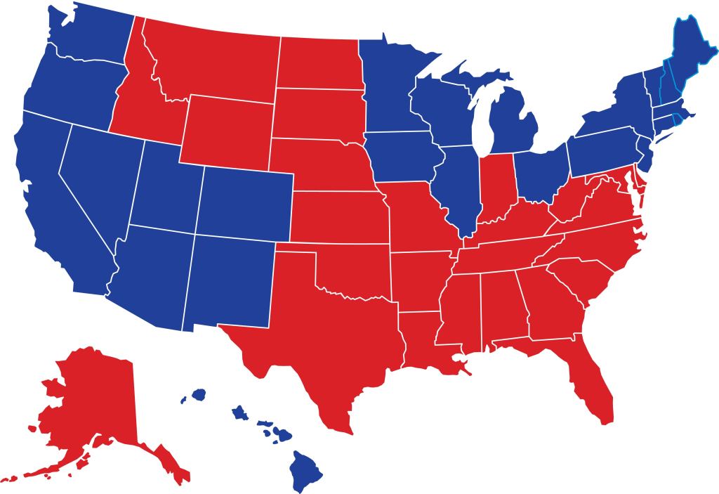 Today Maine is considered to be a Blue State. As of the 2020 election, the country was evenly split between red states and blue states. The deciding factor was population. More Americans live in Blue States such as California and New York with a winner take all than Red States like Alaska and Wyoming.