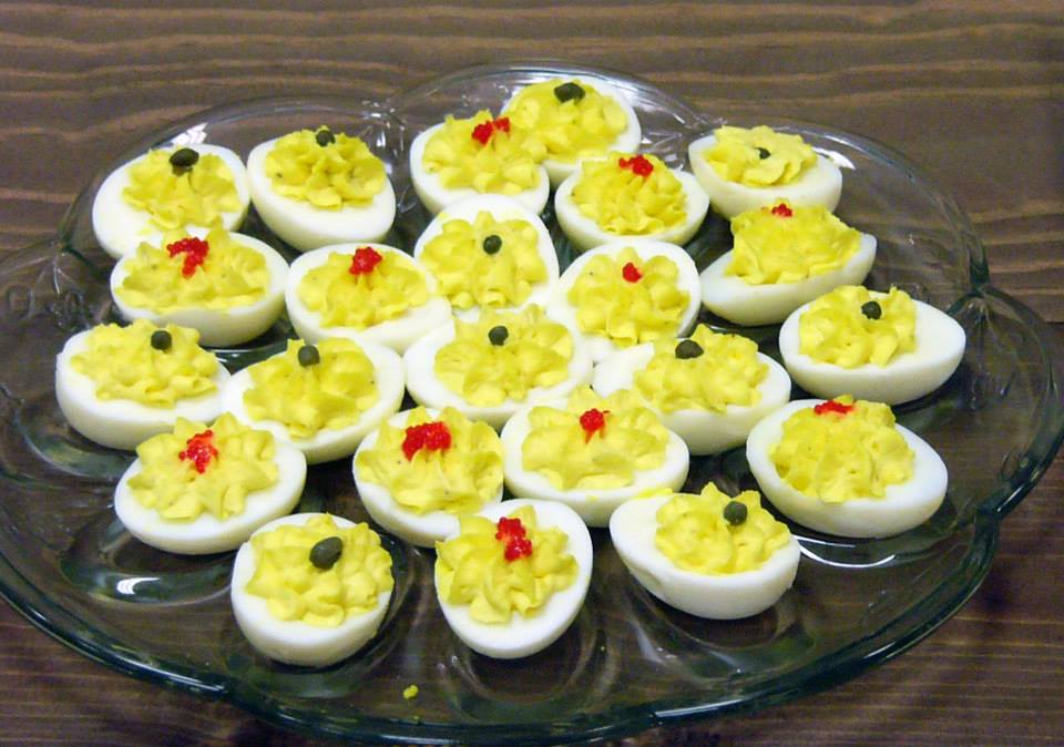Pipe yolk into egg whites. Garnish half of the eggs with caviar, the other half with one or two capers. Arrange on a platter and serve.
