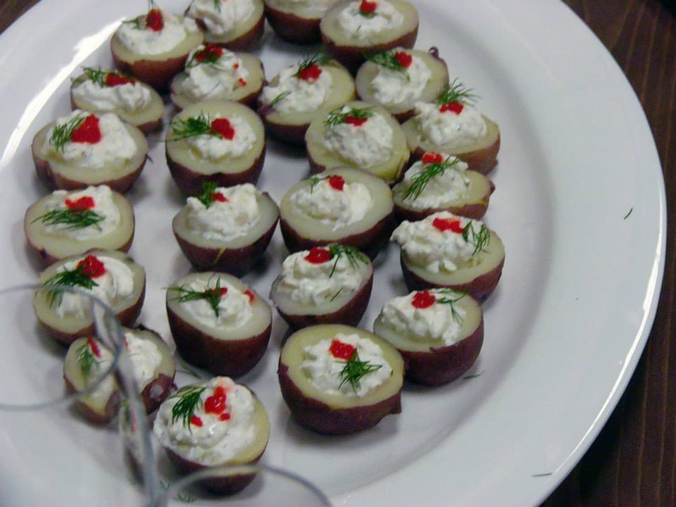 Fill potato wells with about 1 teaspoon sour cream mixture. Garnish with a sprinkling of caviar and fresh dill sprigs. Cover and refrigerate about 2 hours or until chilled.