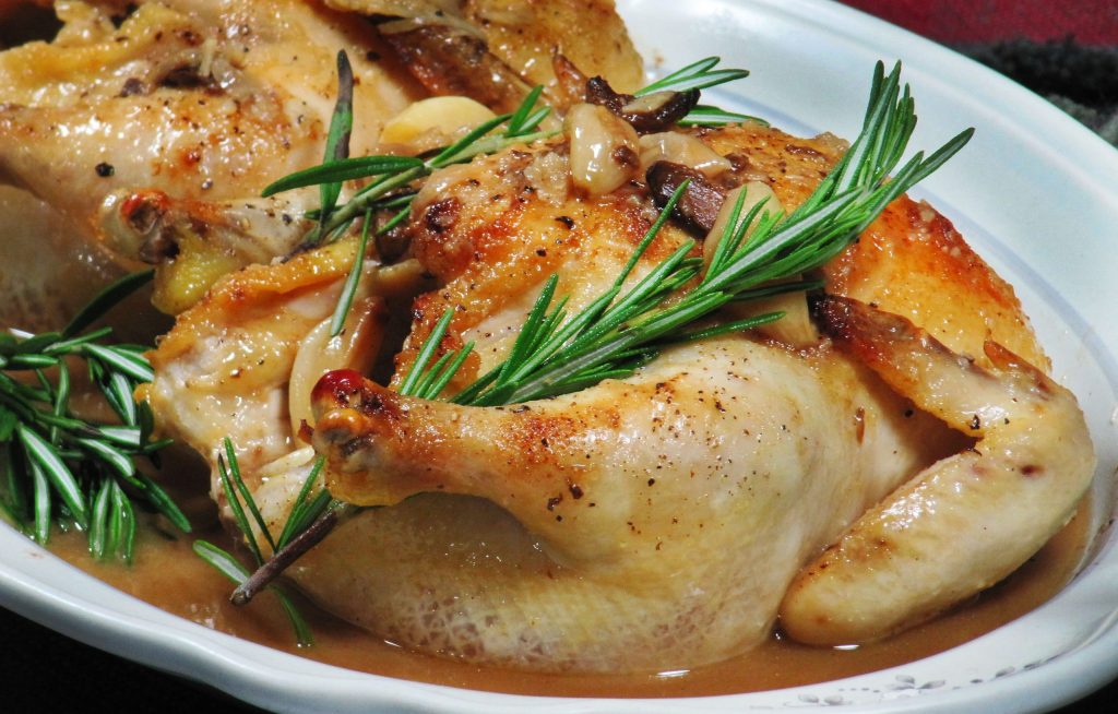 Spoon pan sauce and garlic over the hens. Garnish with rosemary sprigs.