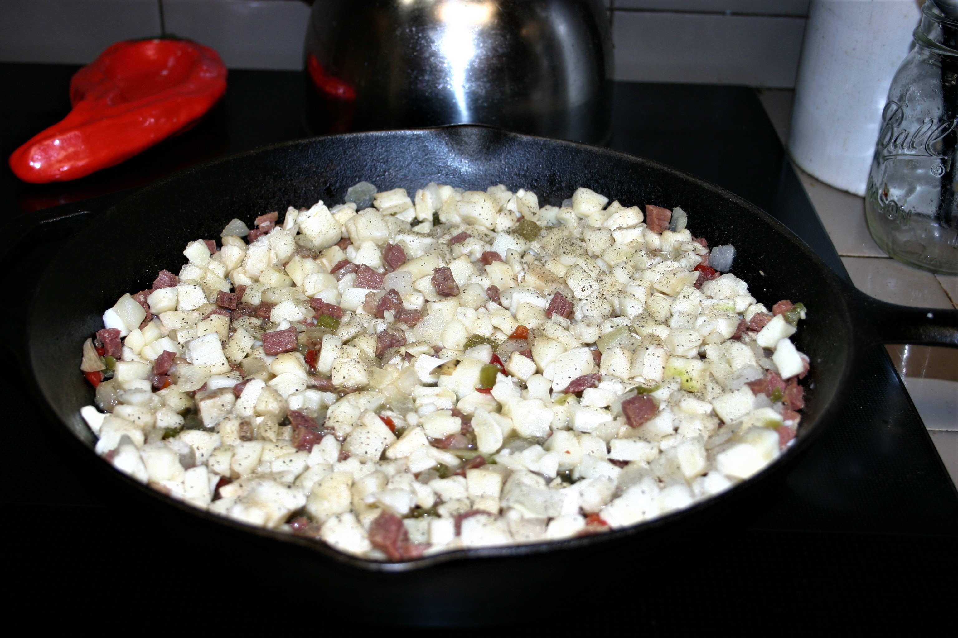 But then the guilt crept in – making corned beef hash just for me was selfish. Kiddo and Hubby both liked a good corned beef hash. Well, I reasoned, I’ve already pushed the start button. I’m committed to make the corned beef. That might be, but it didn’t mean I needed to complete the hash. So once the beef had cooked, it was cubed and put away for the weekend.