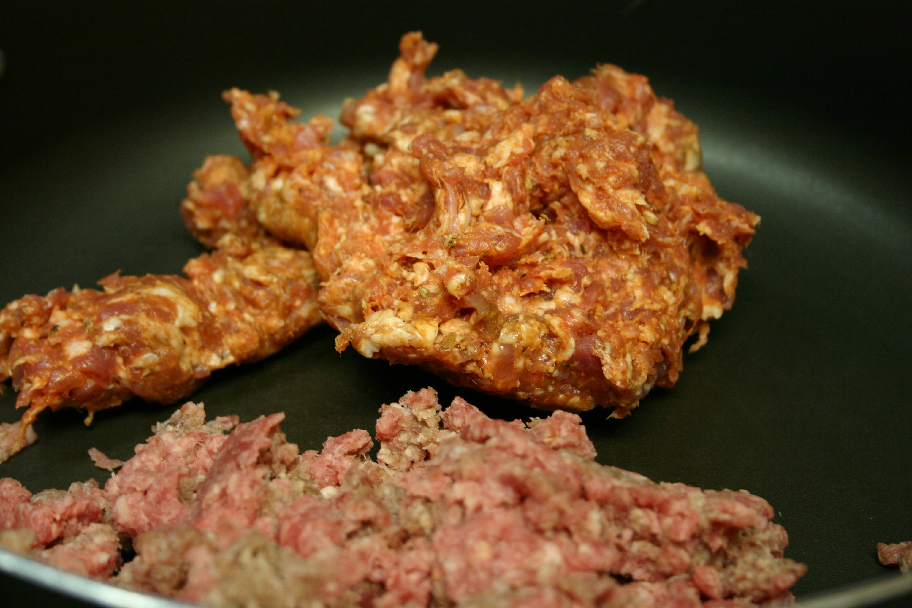 In a large skillet over medium-high heat, brown sausage and ground beef together, breaking meats apart as they brown. Drain well, return to skillet.