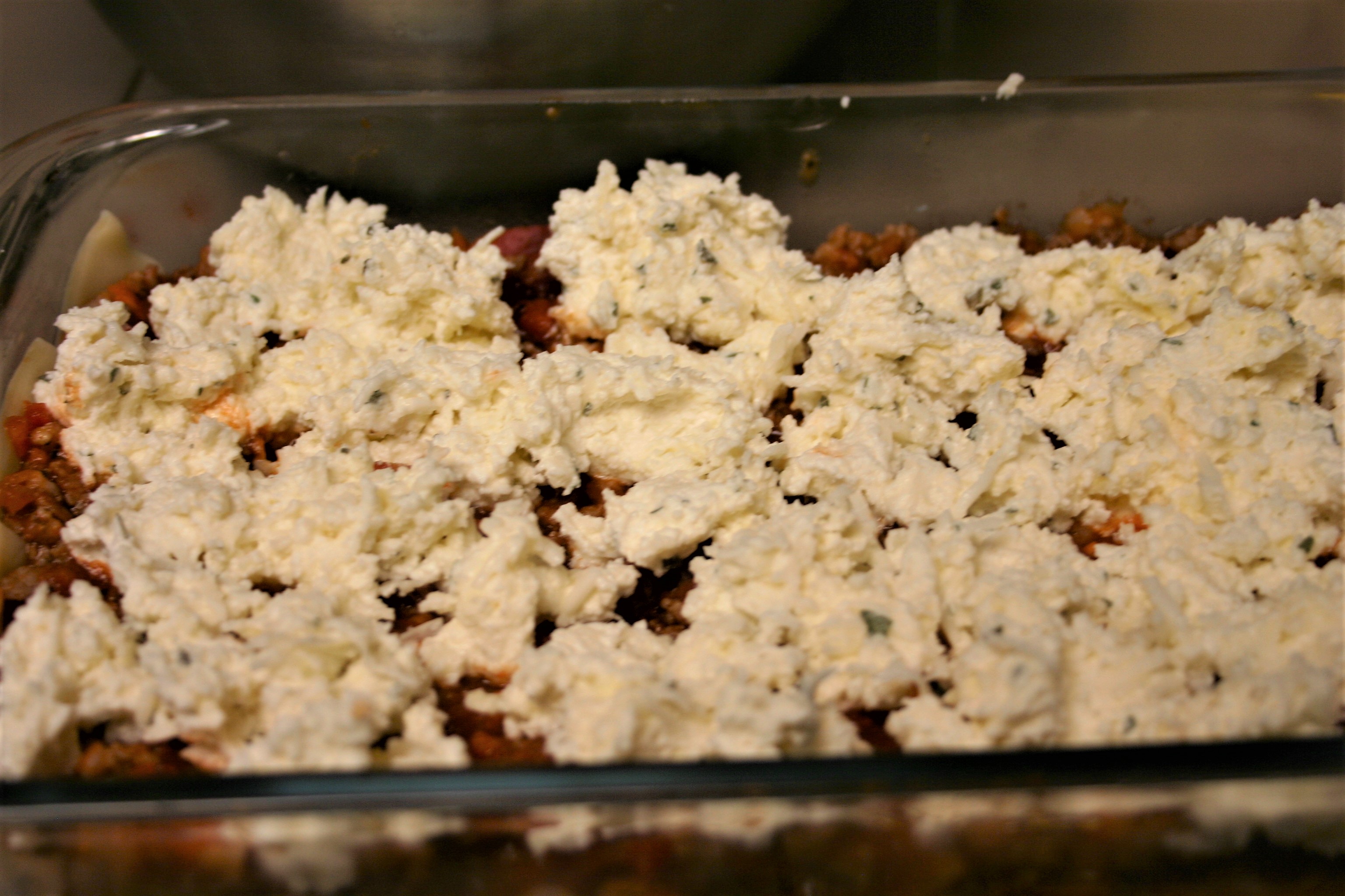 If necessary, trim lasagna noodles to better fit in the casserole dish. Lay 3 trimmed lasagna noodles in the bottom of the casserole dish, slightly overlapping one another. Spoon 1/3 of the meat filling over the noodles, spread out to cover. Scatter 1/3 of the cheese mixture over sauce. Top with another layer of noodles, pressing down slightly. Top noodles with another third of meat sauce, then more cheese mixture. Top with final layer of noodles, final layer of meat and final layer of cheese.
