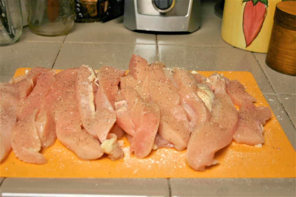 Since I can’t share Chicken Curry, I thought a nice chicken supper would be nice. This recipe actually called for the chicken breasts to be cooked whole, not cut into strips. However; I forgot to thaw my chicken in the fridge a few days ahead of cooking. We have the best freezer – it takes days for anything to thaw (except ground meats). Why do ground meats thaw easily? We buy in bulk, then break up the packages into 1-meal portions. Some of the ground beef, pork or sausage is in 1-pound packages, some in half-pound portions. Then we flatten the ground meat thin. It stacks well and thaws easily. An added bonus is that by pressing the meat flat, there are less ice crystals. Don’t know why, just are.