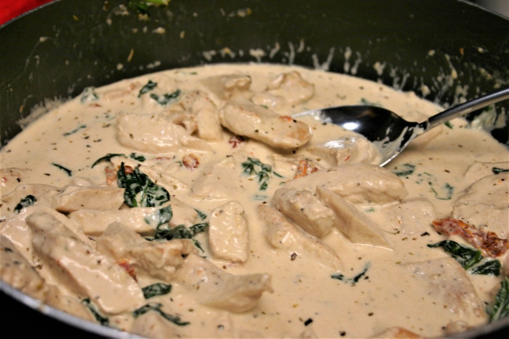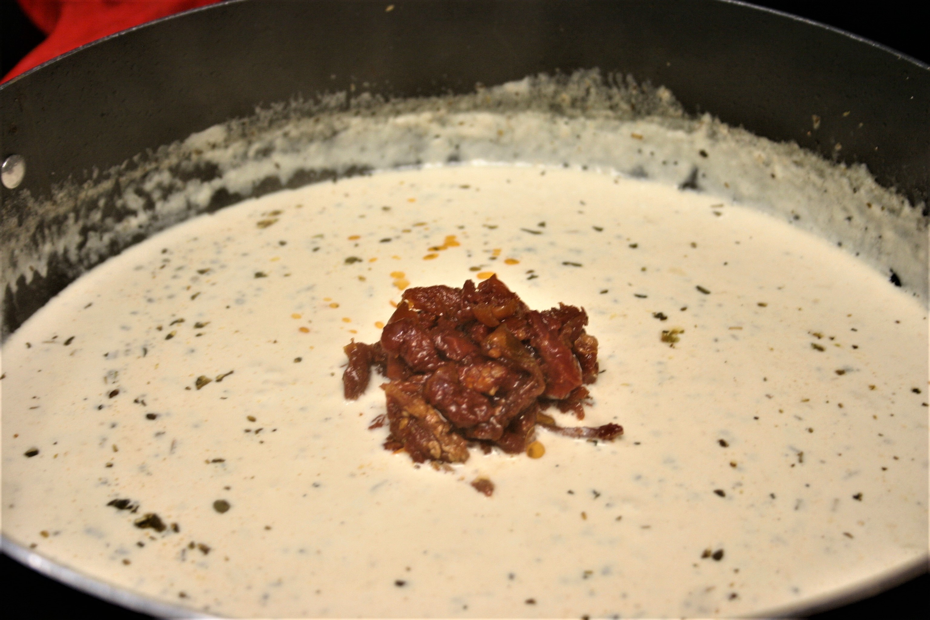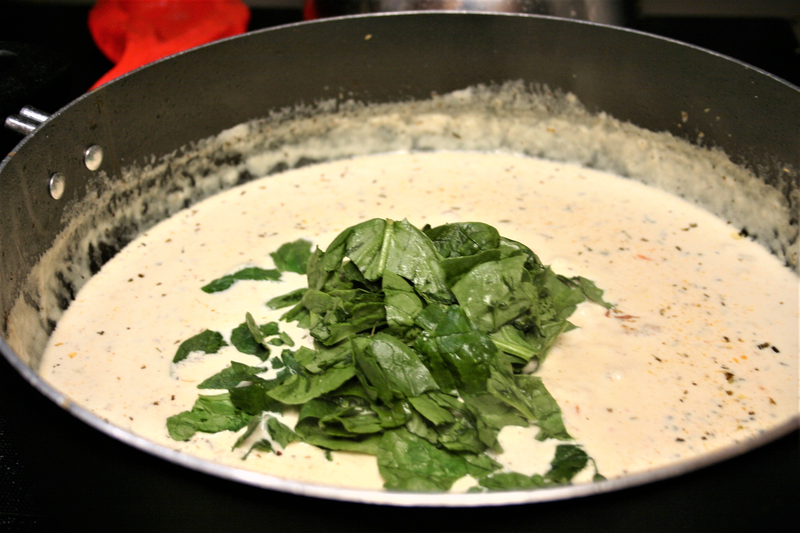 Add sun-dried tomatoes and spinach to the cream sauce. Cook until spinach has wilted.