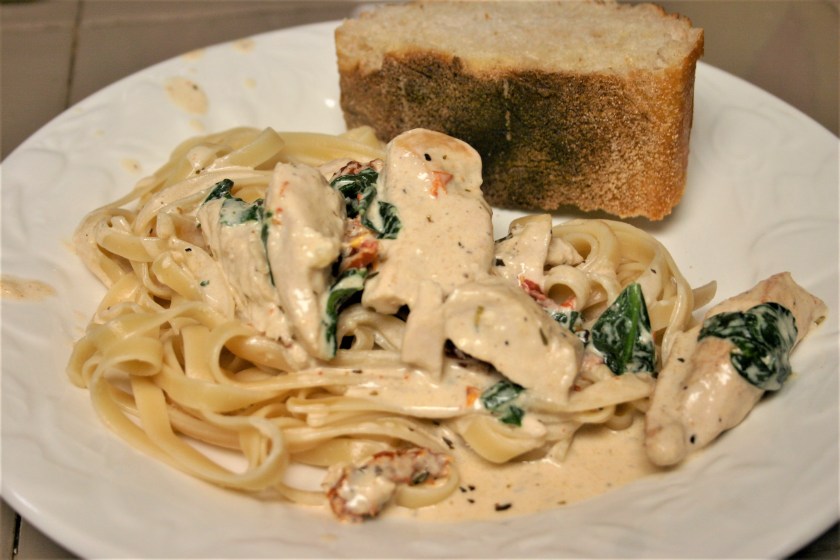 Anyway, when I got ready to make the Chicken, the breasts were still partially frozen. Perfect for slicing, so it was no big deal. This recipe also called for Linguine. What I had on hand in the pantry was Fettuccine. Now I know we could have bought Linguine, it’s not exactly a rare or expensive pasta. But why when Fettuccine would work just fine? Another small change was to use oil from the sun-dried tomatoes rather than olive oil. It just seemed to make sense, adding more flavor to the chicken and the sauce.