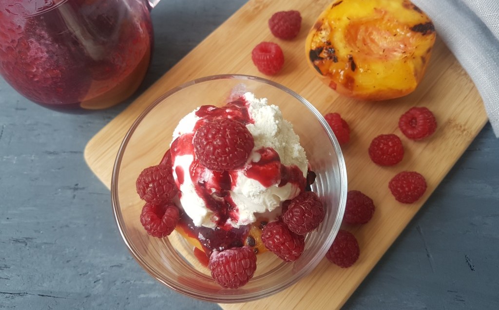 Place peaches, cut side up, in individual short glasses. Top each grilled peach with a scoop of ice cream. Drizzle with raspberry sauce and a sprinkling of whole raspberries.