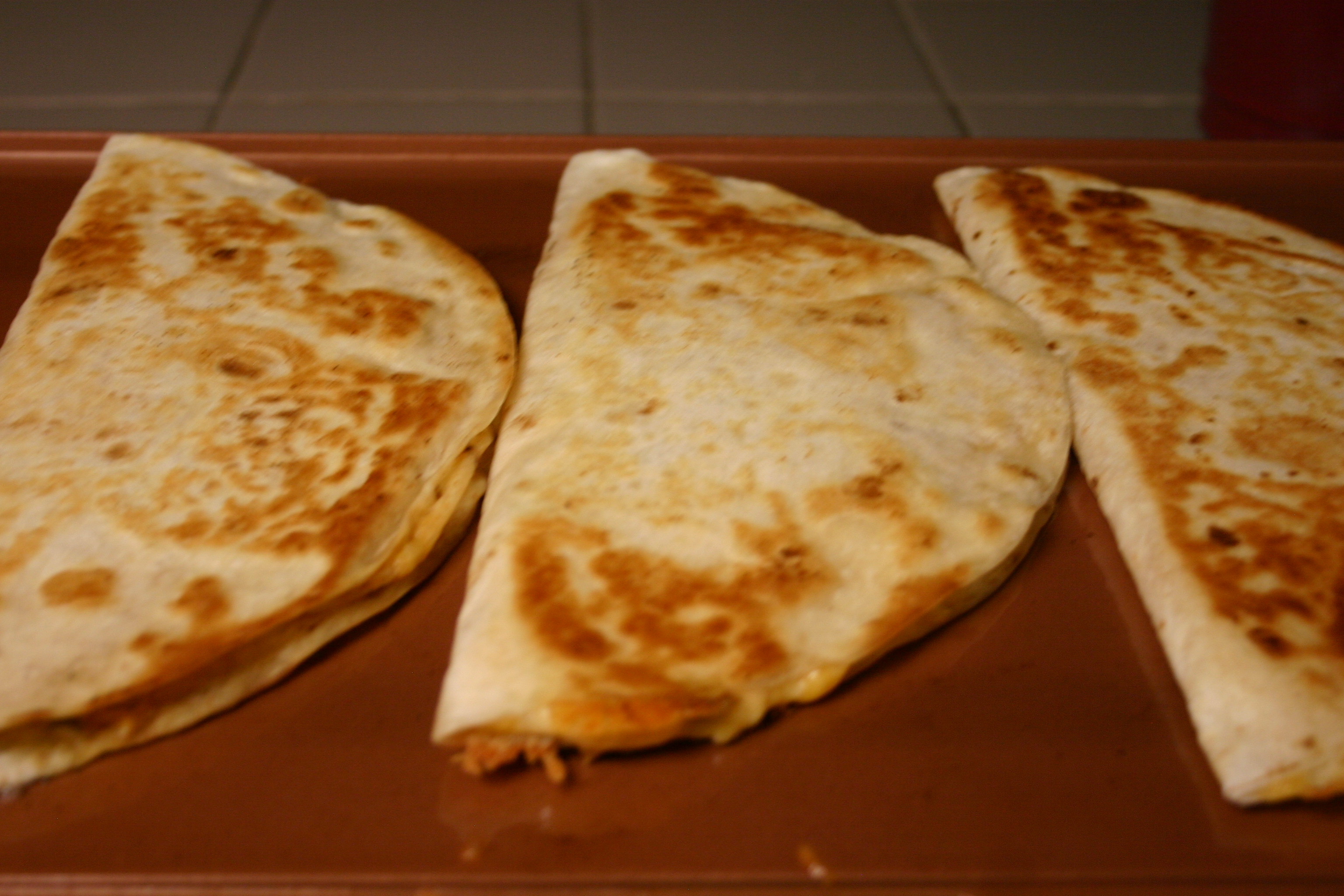 Lay tortillas on a flat worksurface. Spread spicy sauce over tortilla. Spread 1/2 cup of the Mexican Cheese down half of each tortilla. Scatter 1/4 cup of Cheddar Cheese over the Mexican Blend. Fold tortilla in half to cover cheese.