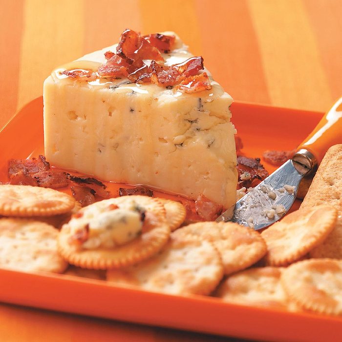 When ready, place blue cheese wedge on a serving platter. Drizzle cheese with honey. Sprinkle bacon over the cheese. Arrange crackers on the platter. Serve and enjoy.