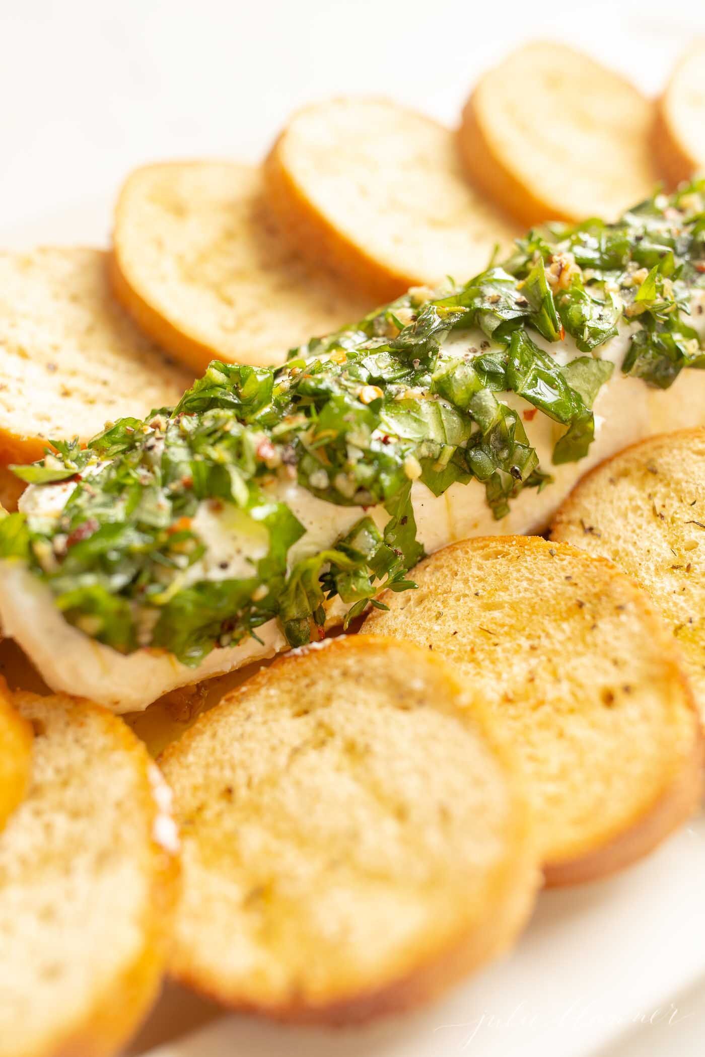 Just before serving, pour olive oil mixture directly over the Chèvre cheese. Surround Chèvre with baguette slices or crackers for serving.