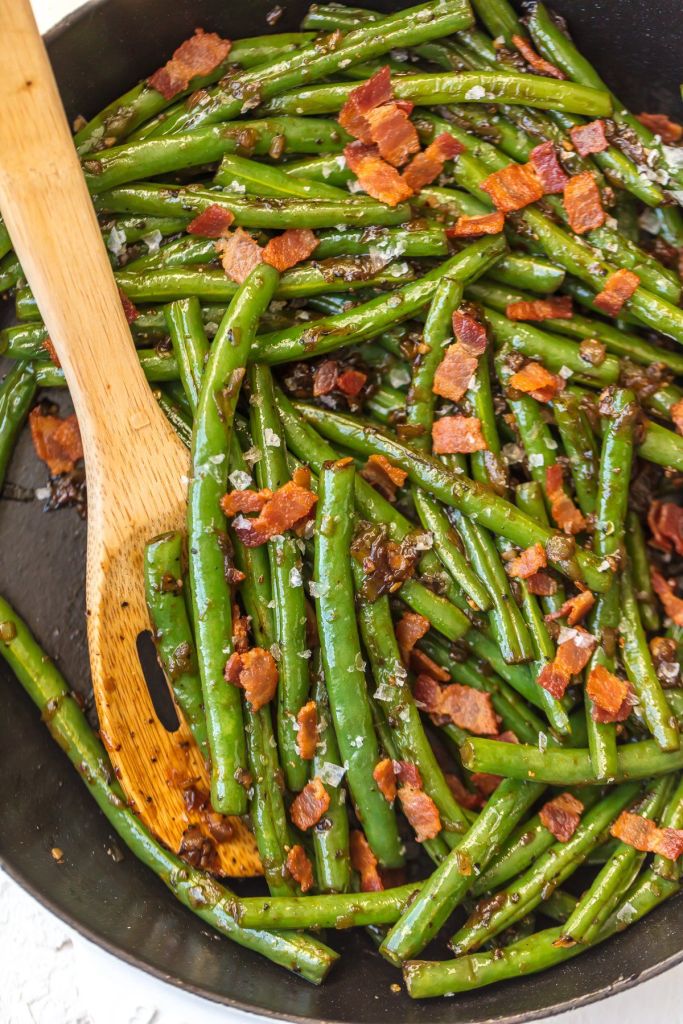 Sprinkle green beans with crisped bacon and serve straight from the pan for a rustic, southern presentation.