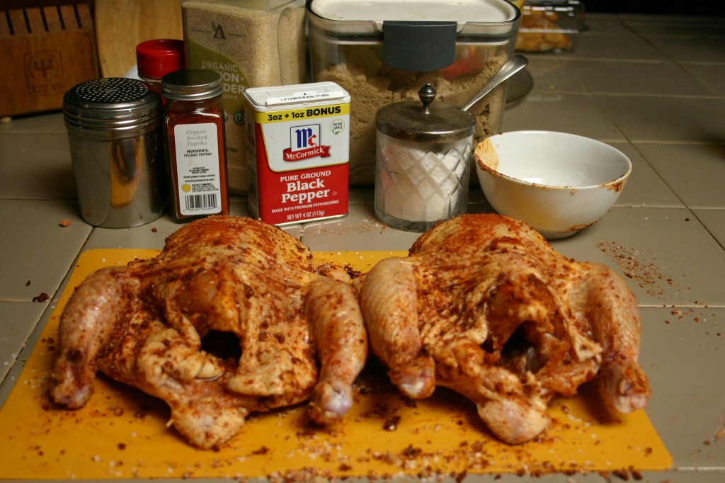 Sprinkle 1 teaspoon brown sugar mixture inside cavity of each hen. Rub 1 tablespoon olive oil into skin of the hens. Sprinkle evenly with remaining brown sugar mixture; rub into skin. Tuck wing tips under the birds. Set aside.