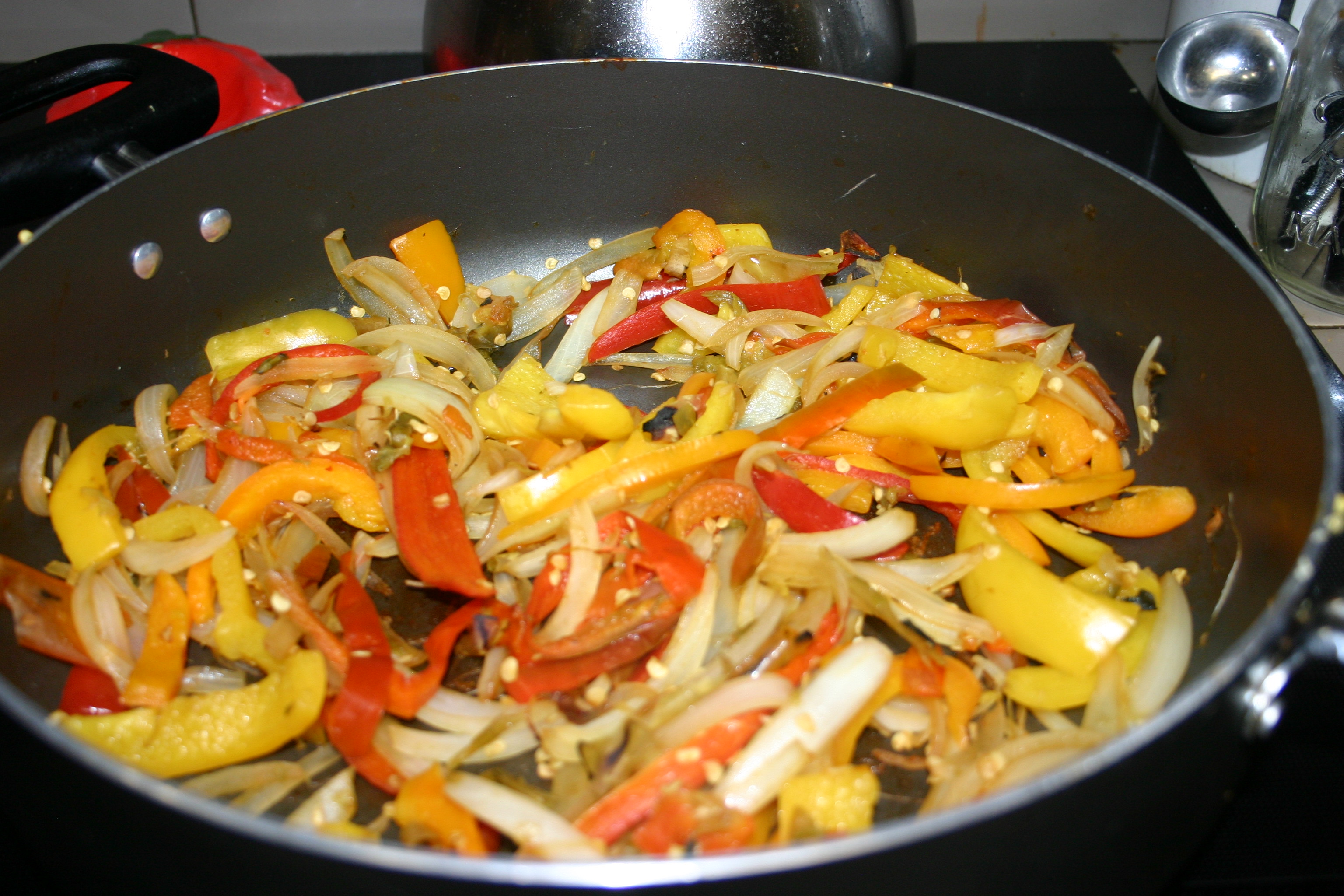 Stem, core and thinly slice bell peppers, set aside. Stem and slice New Mexican peppers. Peel and slice remaining onion into slivers, set aside. Warm a dry skillet over medium heat. Roast peppers with onions until tender, about 15 minutes. Keep warm.