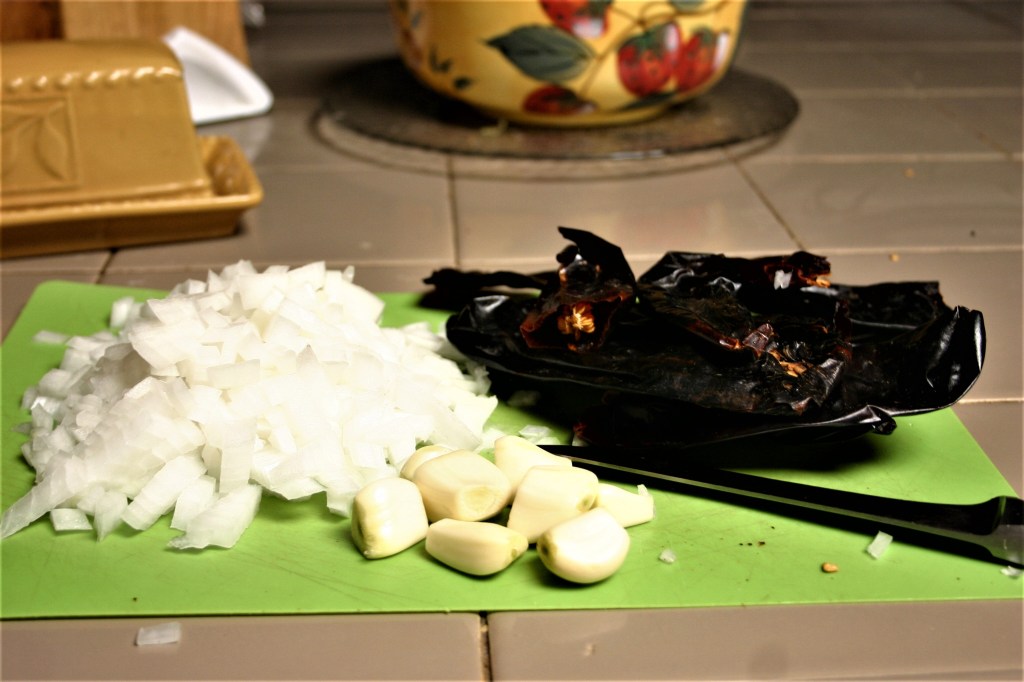 Remove stems and some of the seeds. Peel and chop onion, peel garlic, leave whole.