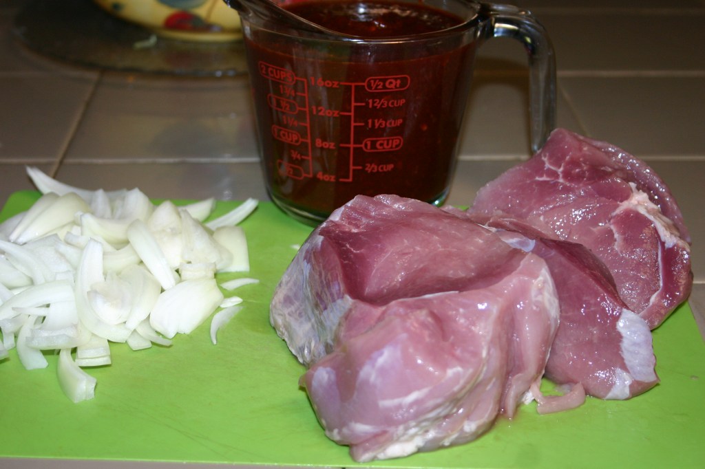 Place pork in the bowl of a the slow-cooker. Scatter onion over the top of the pork.
