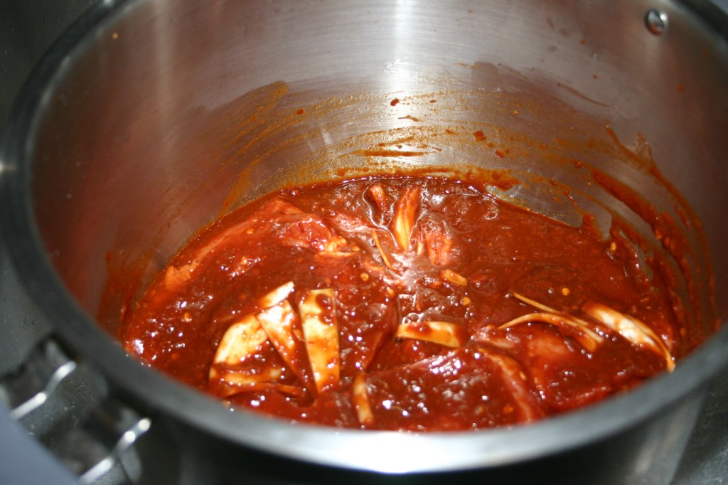 Strain out the cooking liquid and reserve. Puree the chilis in a blender, adding the reserved liquid a little at a time to desired consistency similar to a tomato sauce.