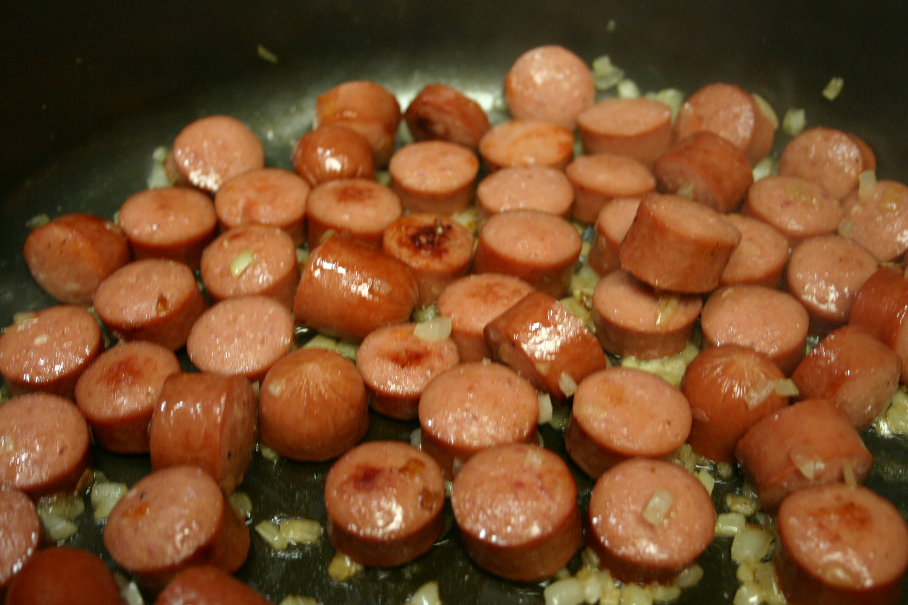 Cut hot dogs into bite-size pieces. Set aside. Finely dice a quarter on an onion, set aside.