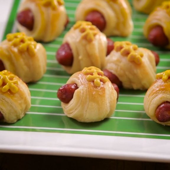 Bake in heated oven for 12 minutes or until tops are deep golden brown. Cool 2 minutes. On each, squeeze 1 line of mustard crosswise and 3 lines lengthwise to make laces of football. Serve warm.
