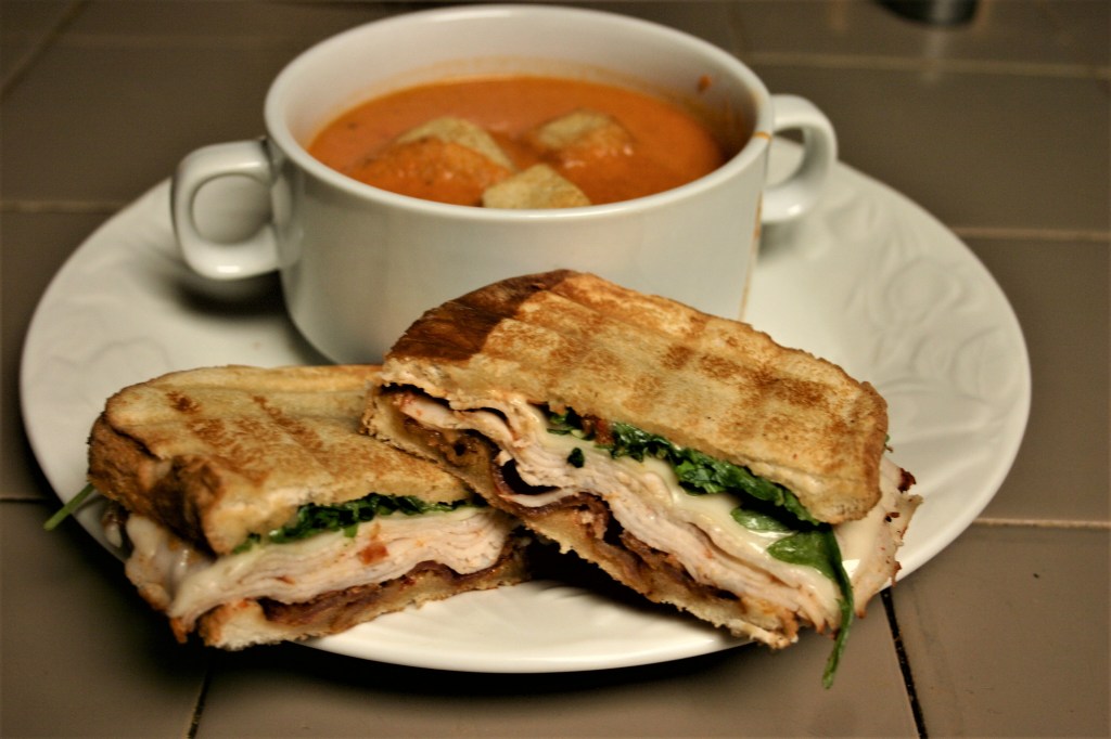 Smoked Turkey Club Panini with Tomato Basil Soup