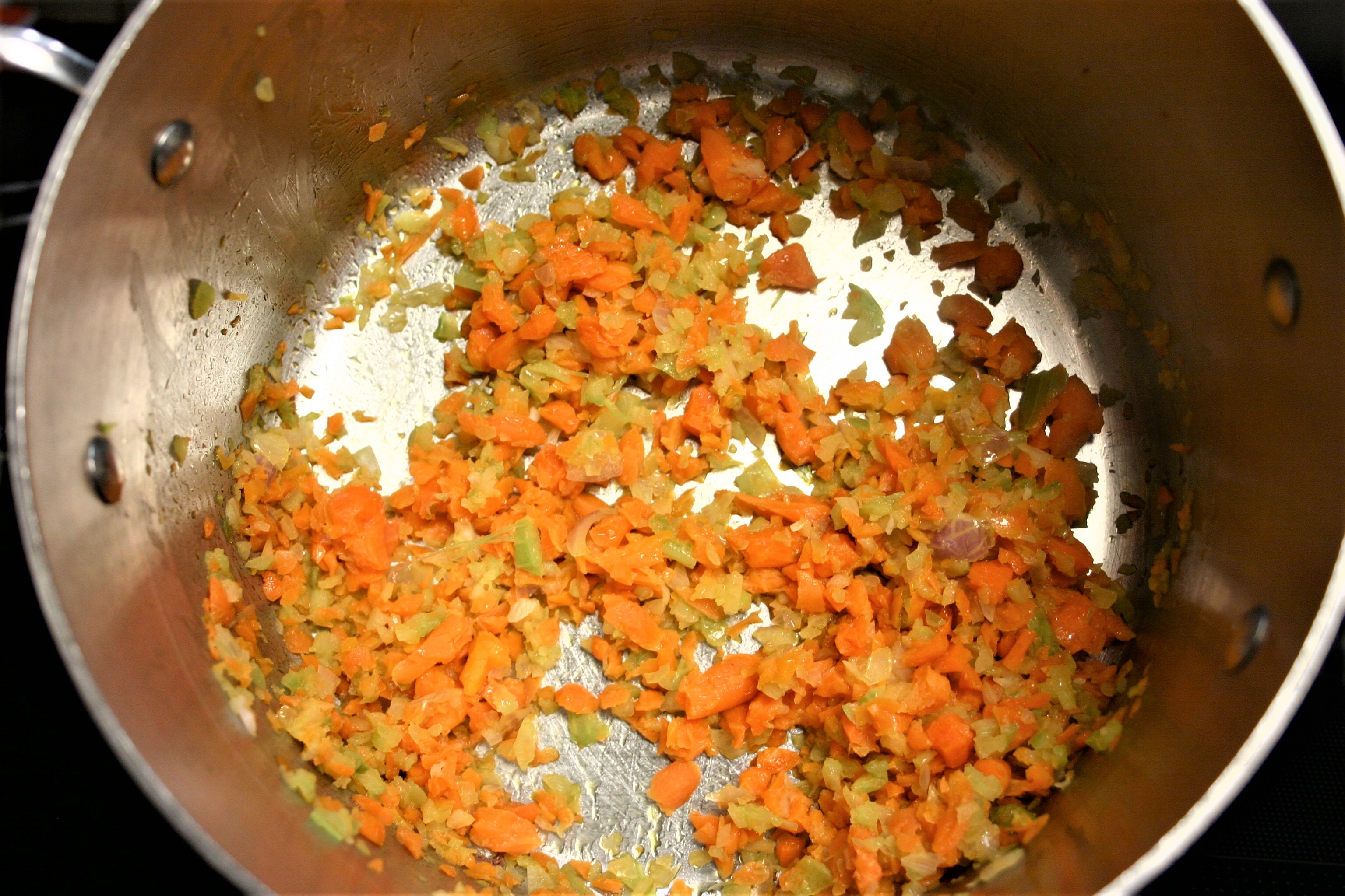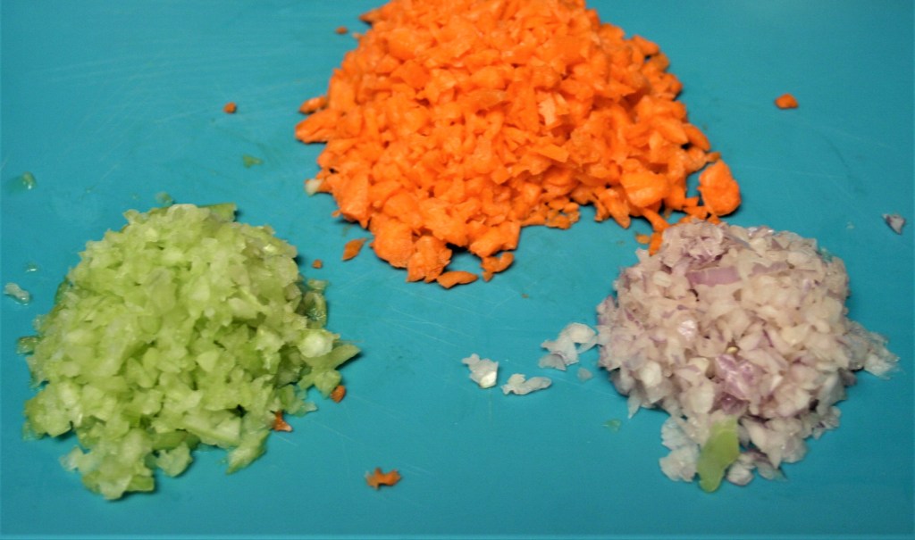 Trim and finely dice celery, set aside. Finely dice carrots, set aside. Peel and finely dice shallot, set aside.