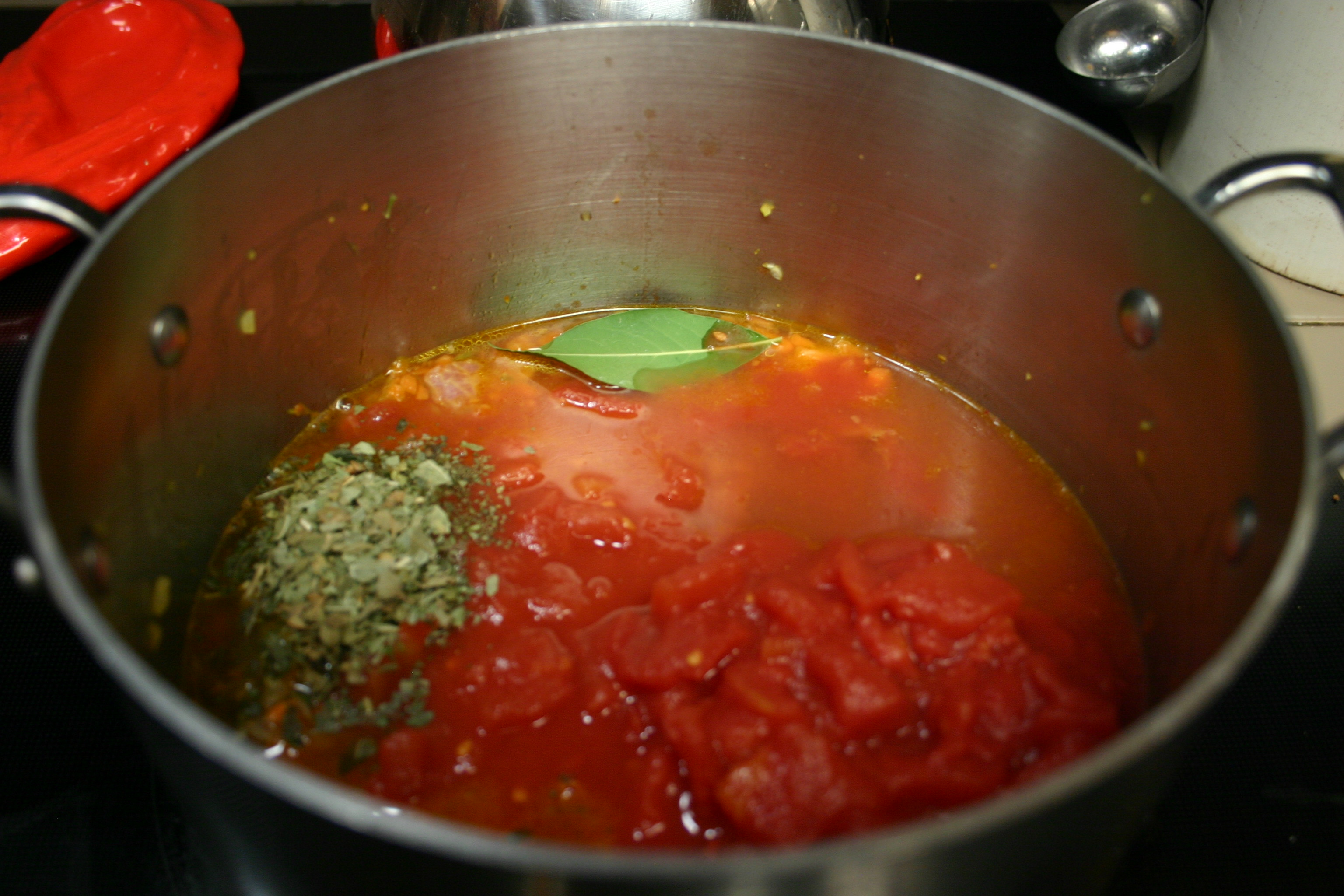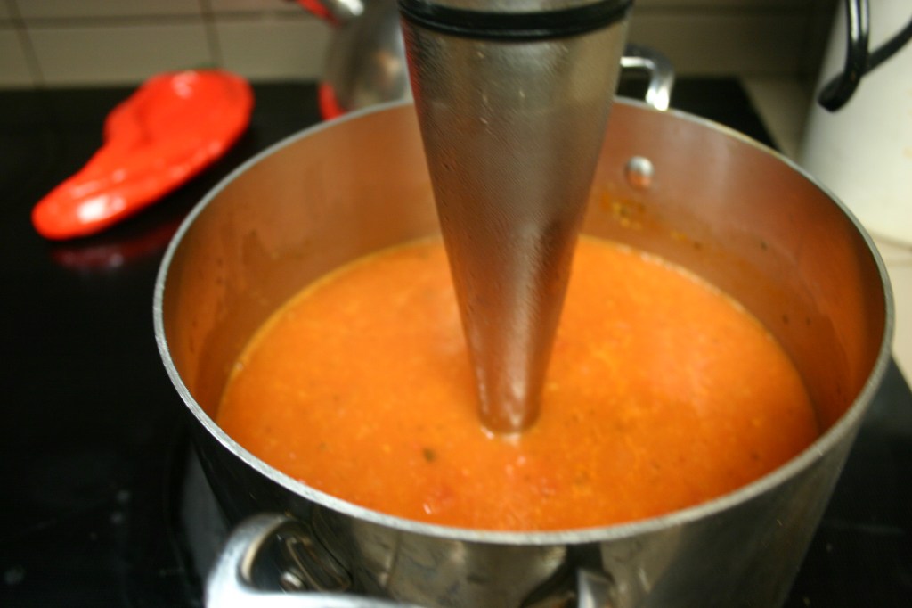 Remove bay leaf from soup. With an hand-held blender, carefully puree the tomatoes and vegetables in the soup.