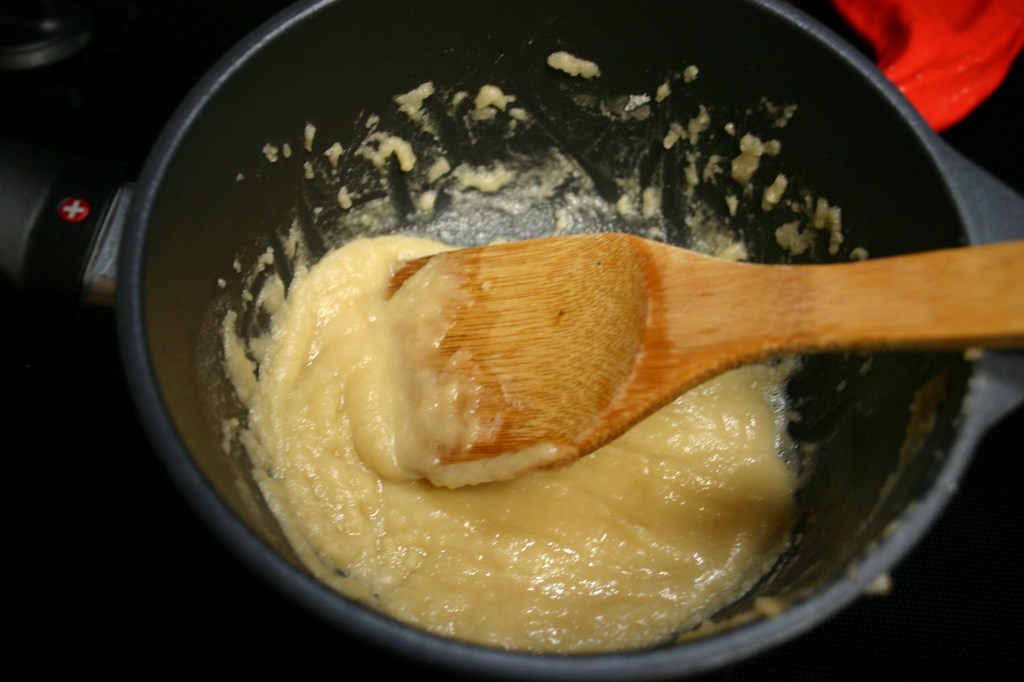 Whisking constantly, slowly add a small ladle-full of the hot soup to the roux. Whisk until smooth and bubbly. Add another ladle-full and stir again until smooth. Add a final ladle-full and stir until smooth. Set aside.
