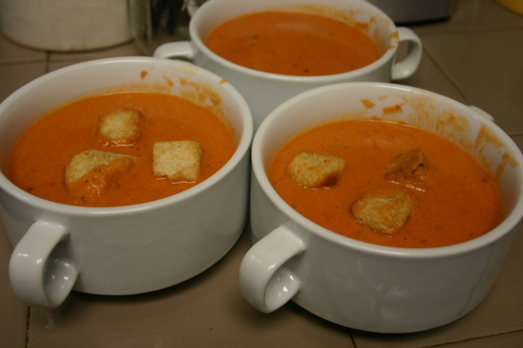 Soup will be very hot. Ladle into bowls to cool slightly. Garnish with croutons if desired.