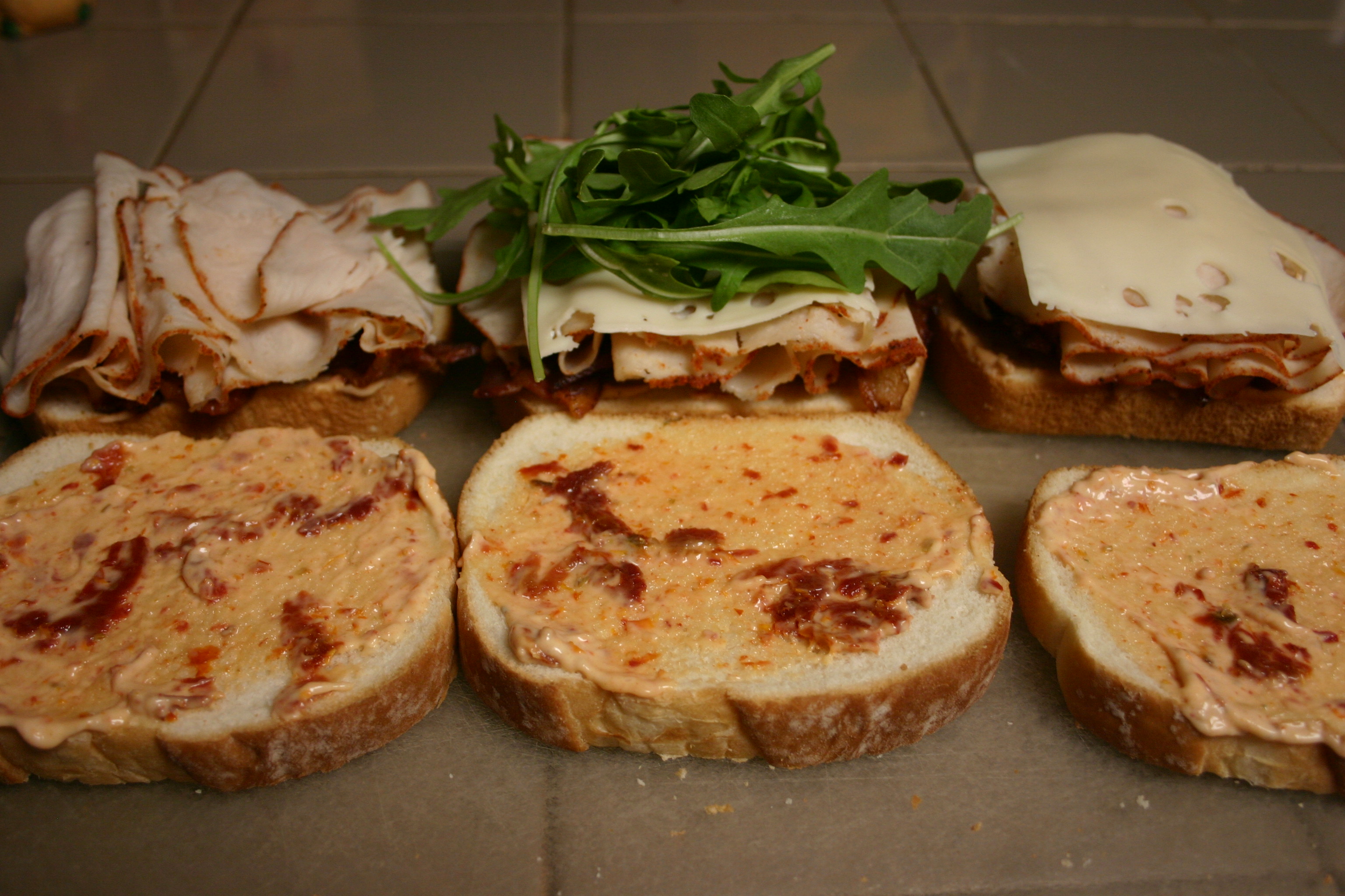 Lightly spread butter over one side of each bread. Lay the butter-sides down on a cutting board. Spread each slice with the sun-dried tomato mayonnaise.