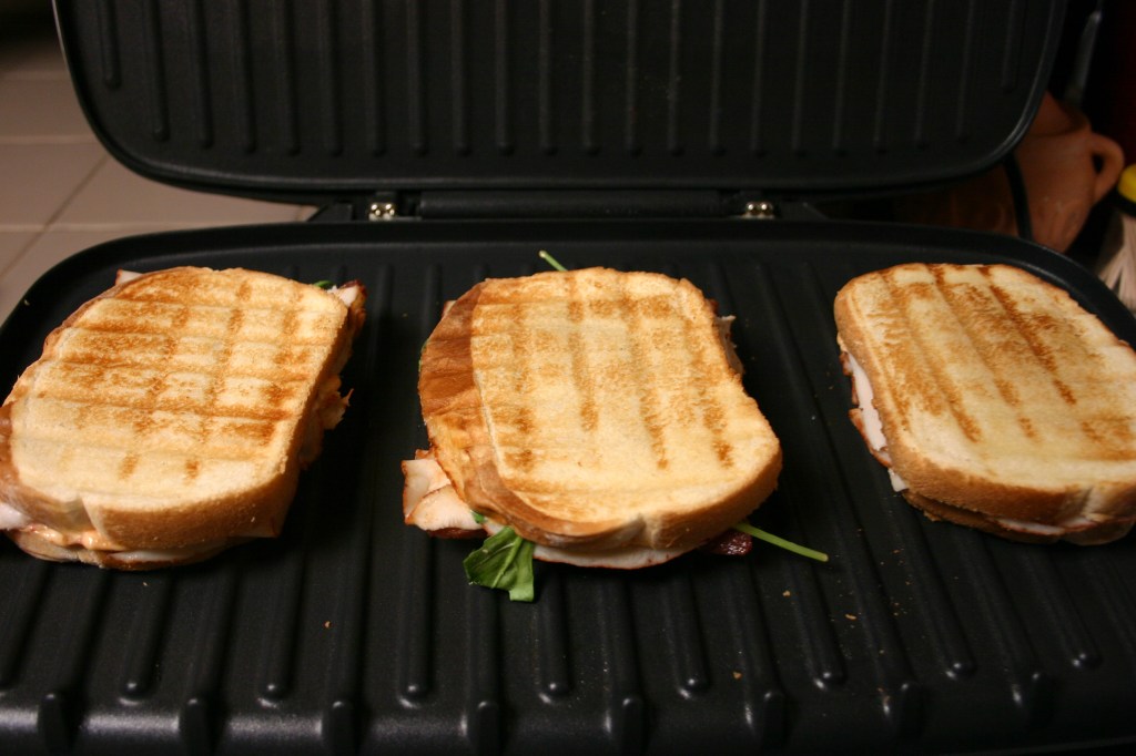 Heat panini press for 2 minutes. Cook the sandwiches heated press for about 5 minutes or until golden and the cheese has melted.