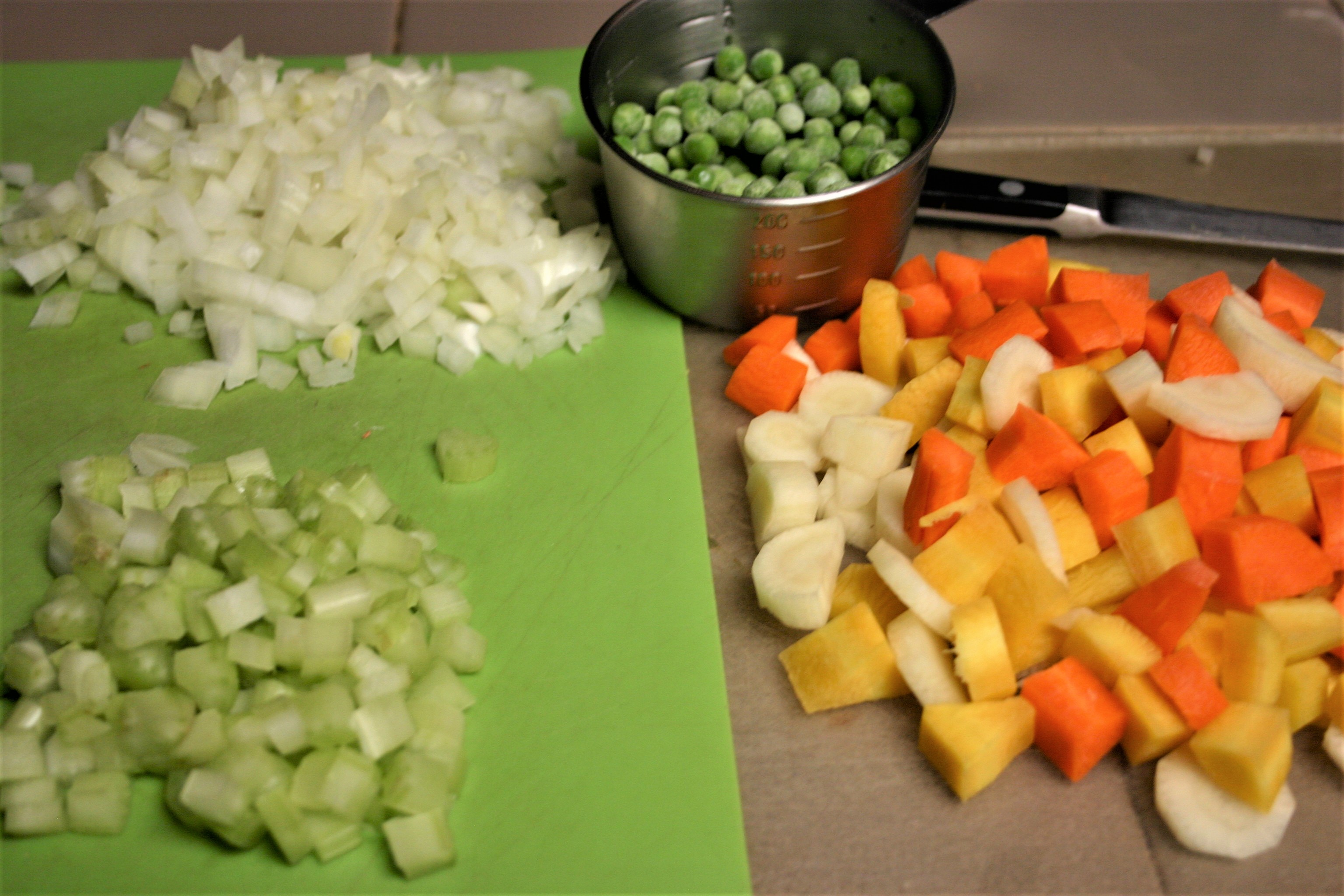 While the chicken breasts are cooking, clean and chop celery, set aside. Peel and chop carrots into small pieces, set aside. Peel and dice onion, set aside.