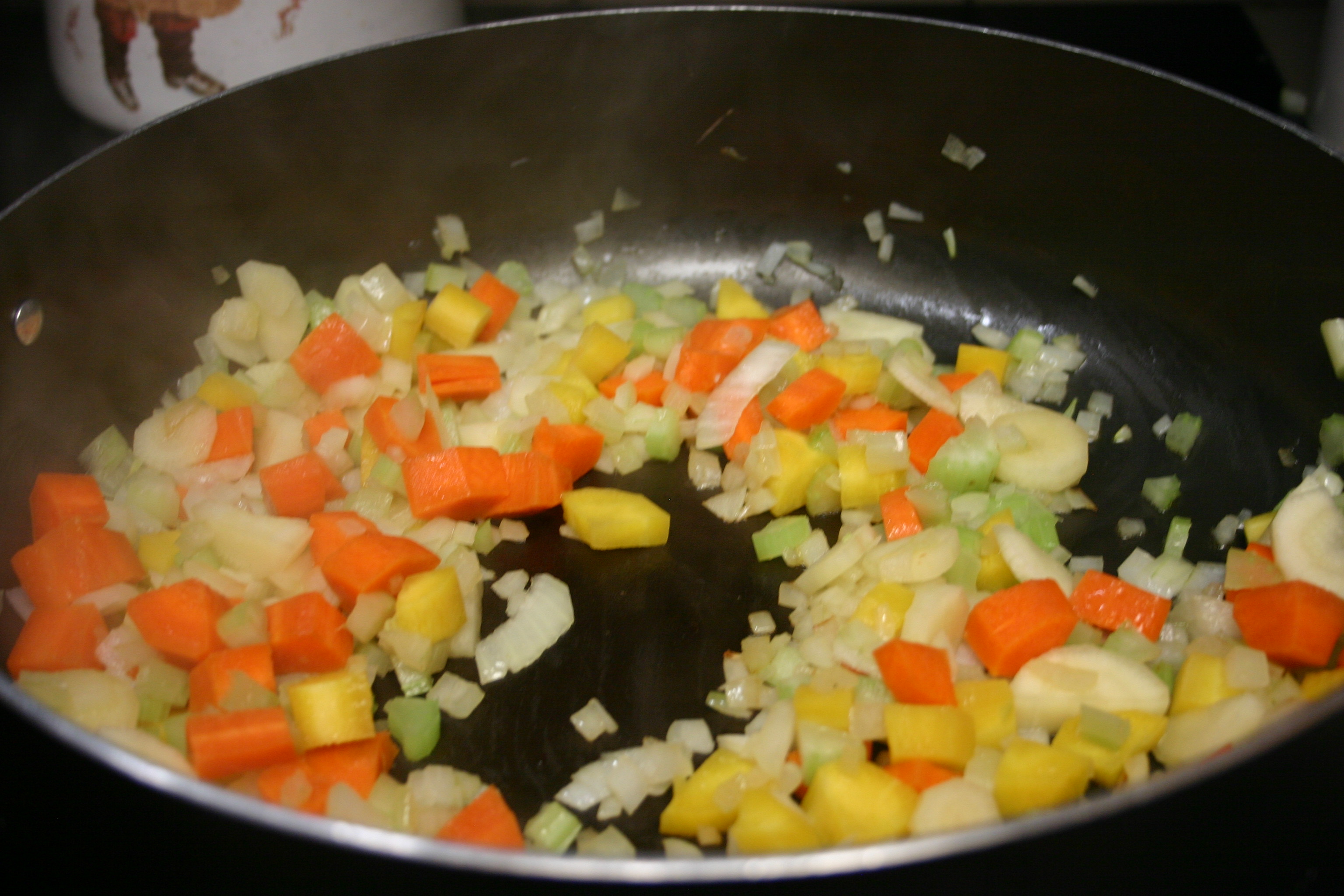 Heat the 1 tablespoon of olive oil in a large skillet over medium heat, swirling the pan to distribute the oil as it warms. Add the celery, carrots, and onion. Sauté until the vegetables are softened and the vegetables begin to brown, about 10 minutes. Season with 1/2 teaspoon each salt, thyme and crushed rosemary. Sprinkle with 1/4 teaspoon coarse-ground black pepper. Stir to blend well.