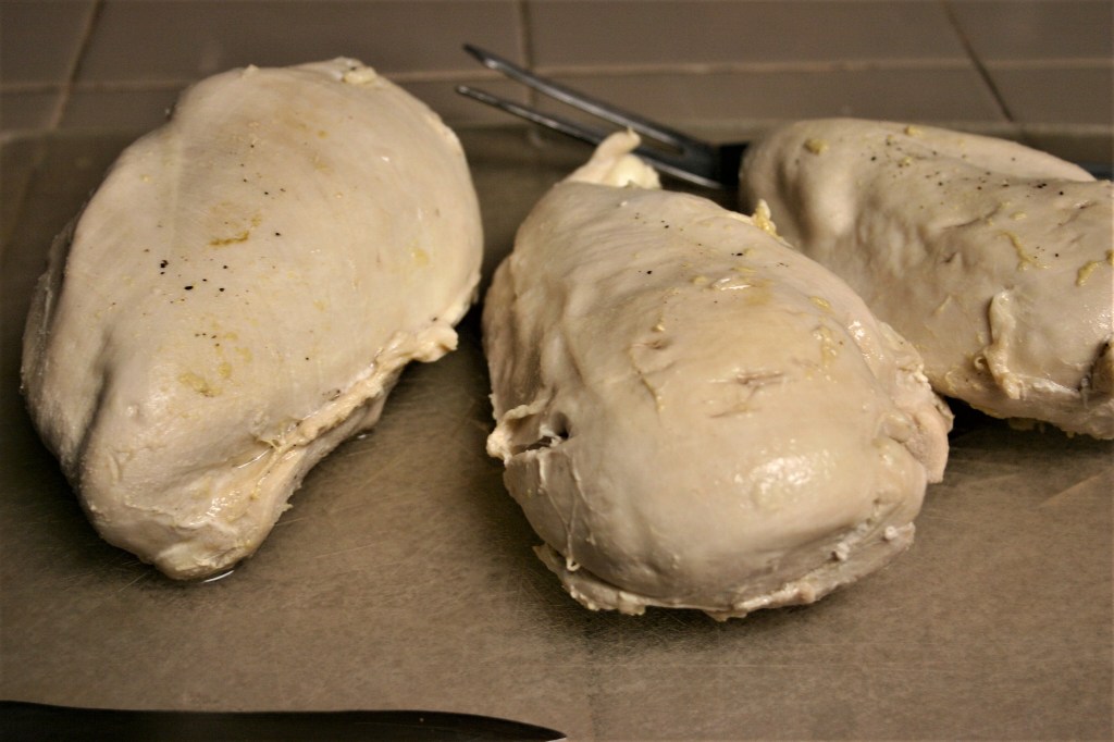In a large Dutch Oven, bring chicken breasts, chicken stock and water to a boil. Continue to boil until chicken breasts are cooked through, about 20 minutes. Remove chicken breasts from stock, set aside and let cool.