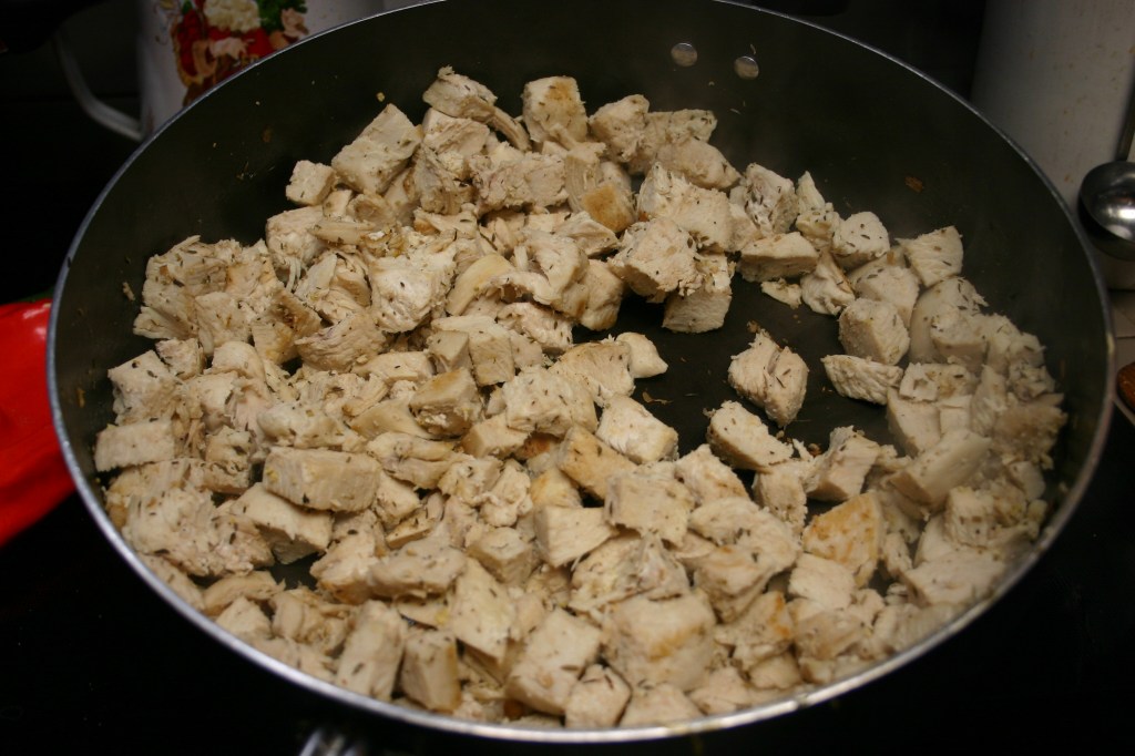 Cut chicken breasts into bite-size cubes. Season with remaining salt, thyme, crushed rosemary and black pepper. Add a little more oil to the empty skillet. Heat over medium heat. Add chicken and brown, turning with a spatula for even coloring, about 6 to 8 minutes.