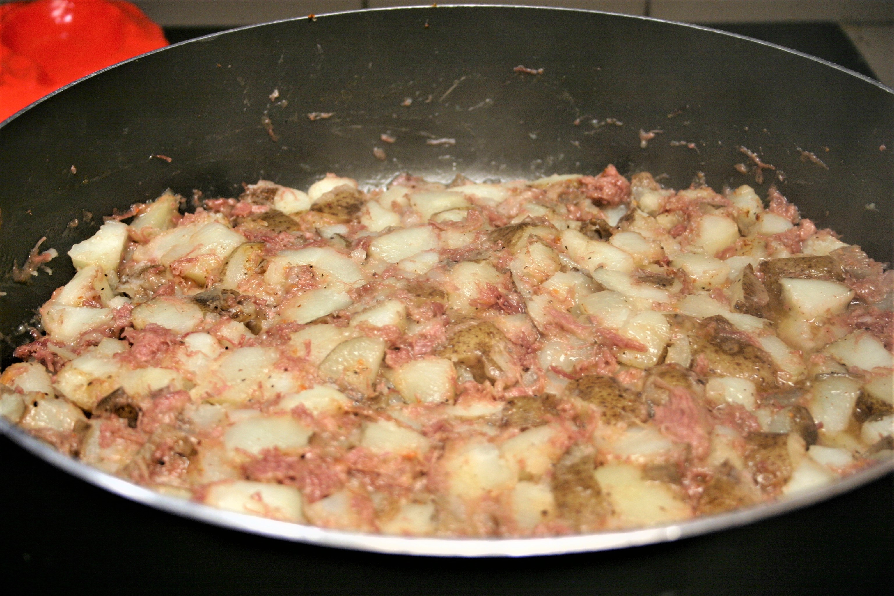 Meanwhile, slice onion in half from root to tip. Reserve half for another purpose. Peel remaining half, cut into thin slivers and set aside. Open canned corned beef and remove meat from the tin can. Break up meat into large chunks. Set aside.